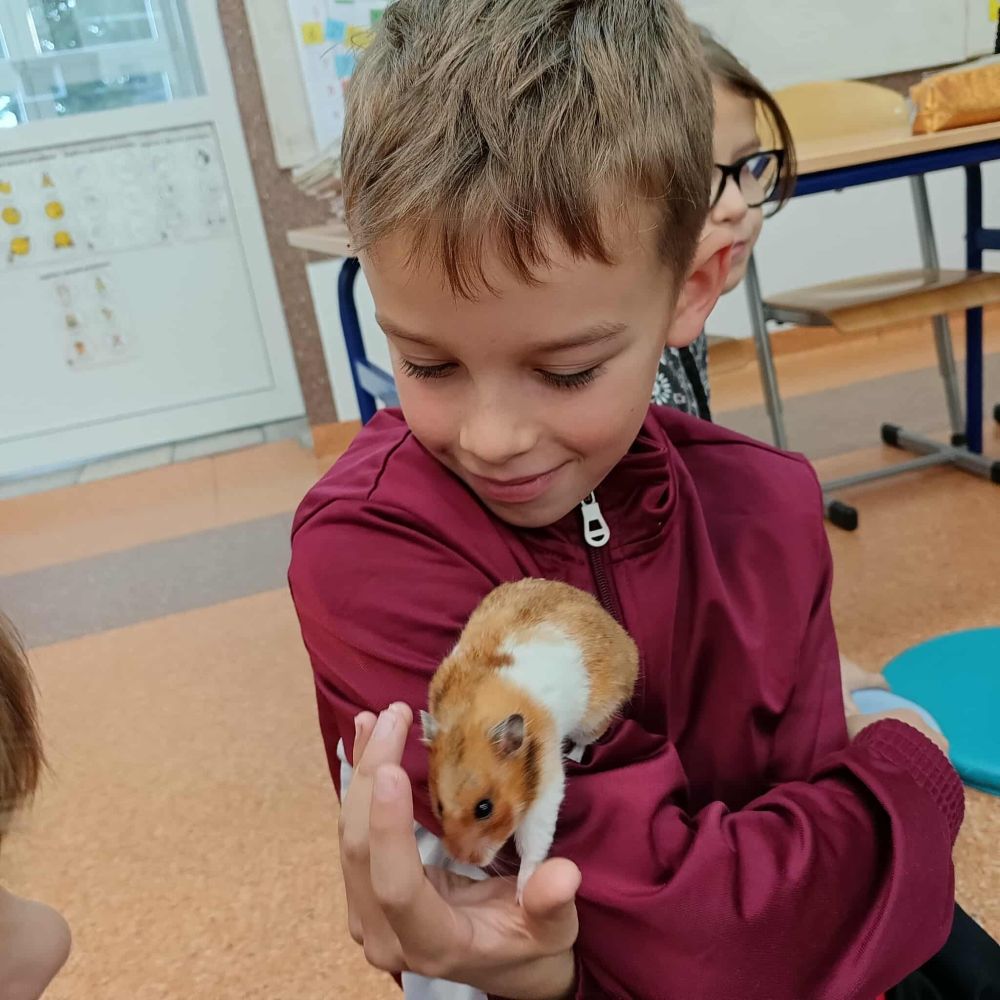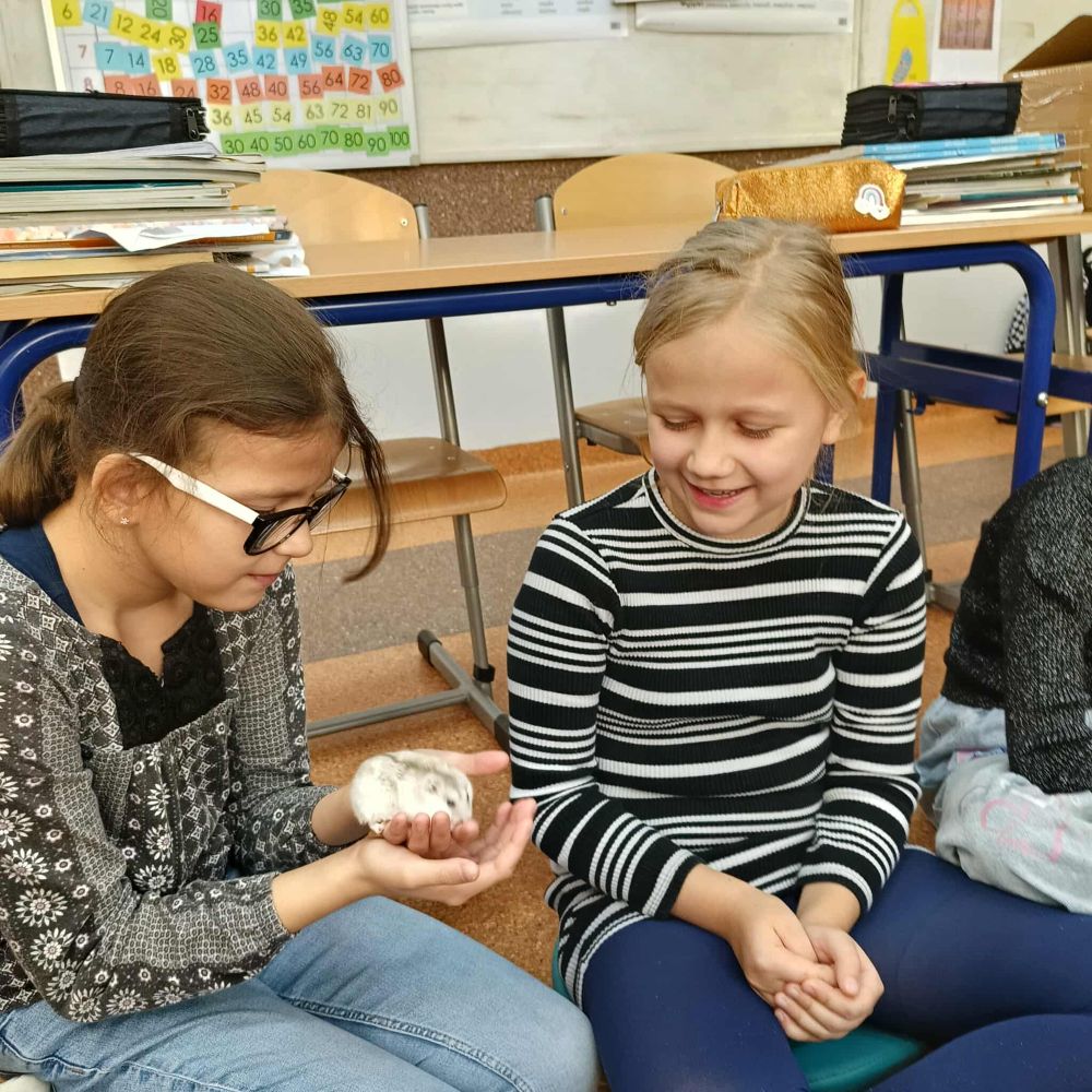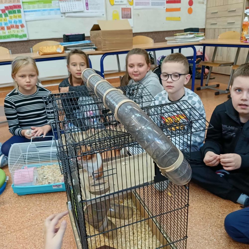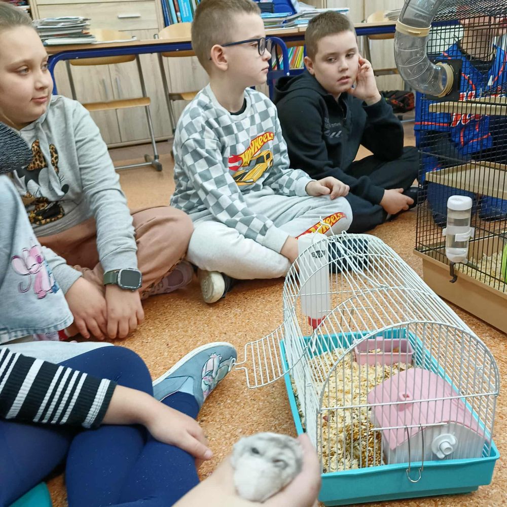 Z inicjatywy Samorządu Uczniowskiego klasa 3B rozpoczęła spotkania ze zwierzętami. Tym razem były to chomiki, Chmurka i Perełka. Rozmowy o zwierzętach trwały długo i były doskonałą okazją do napisania opowiadania.