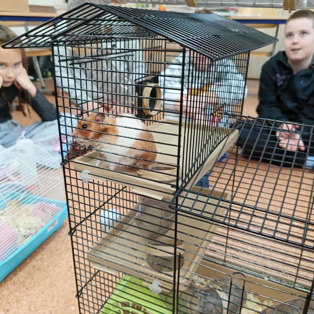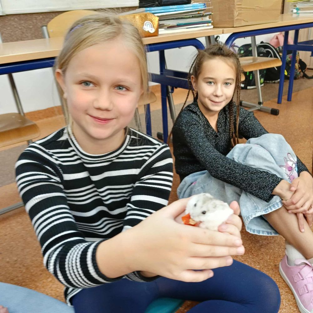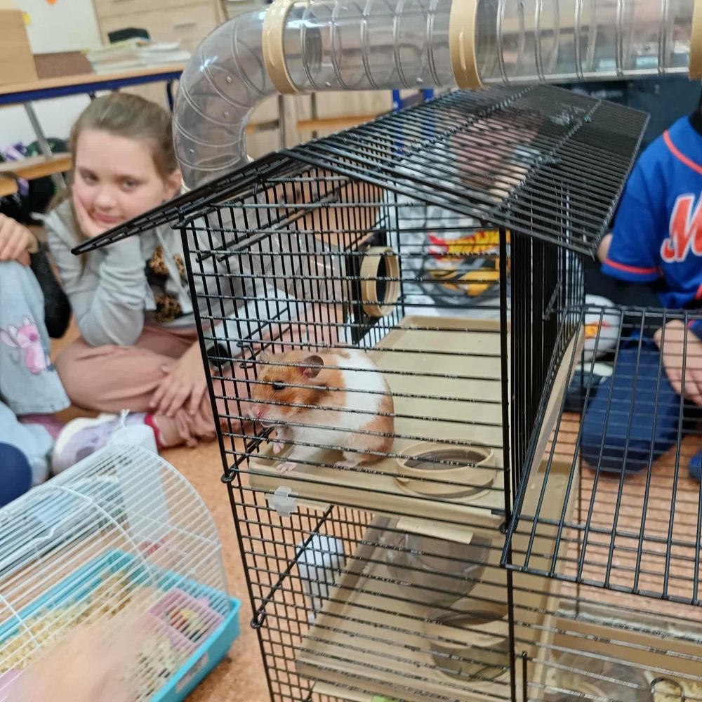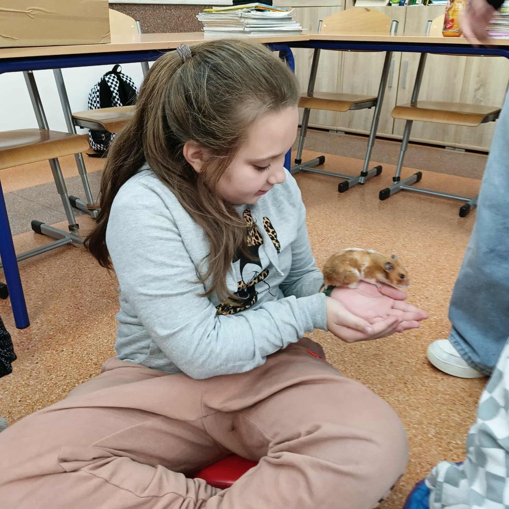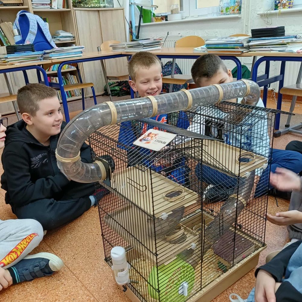 Z inicjatywy Samorządu Uczniowskiego klasa 3B rozpoczęła spotkania ze zwierzętami. Tym razem były to chomiki, Chmurka i Perełka. Rozmowy o zwierzętach trwały długo i były doskonałą okazją do napisania opowiadania.