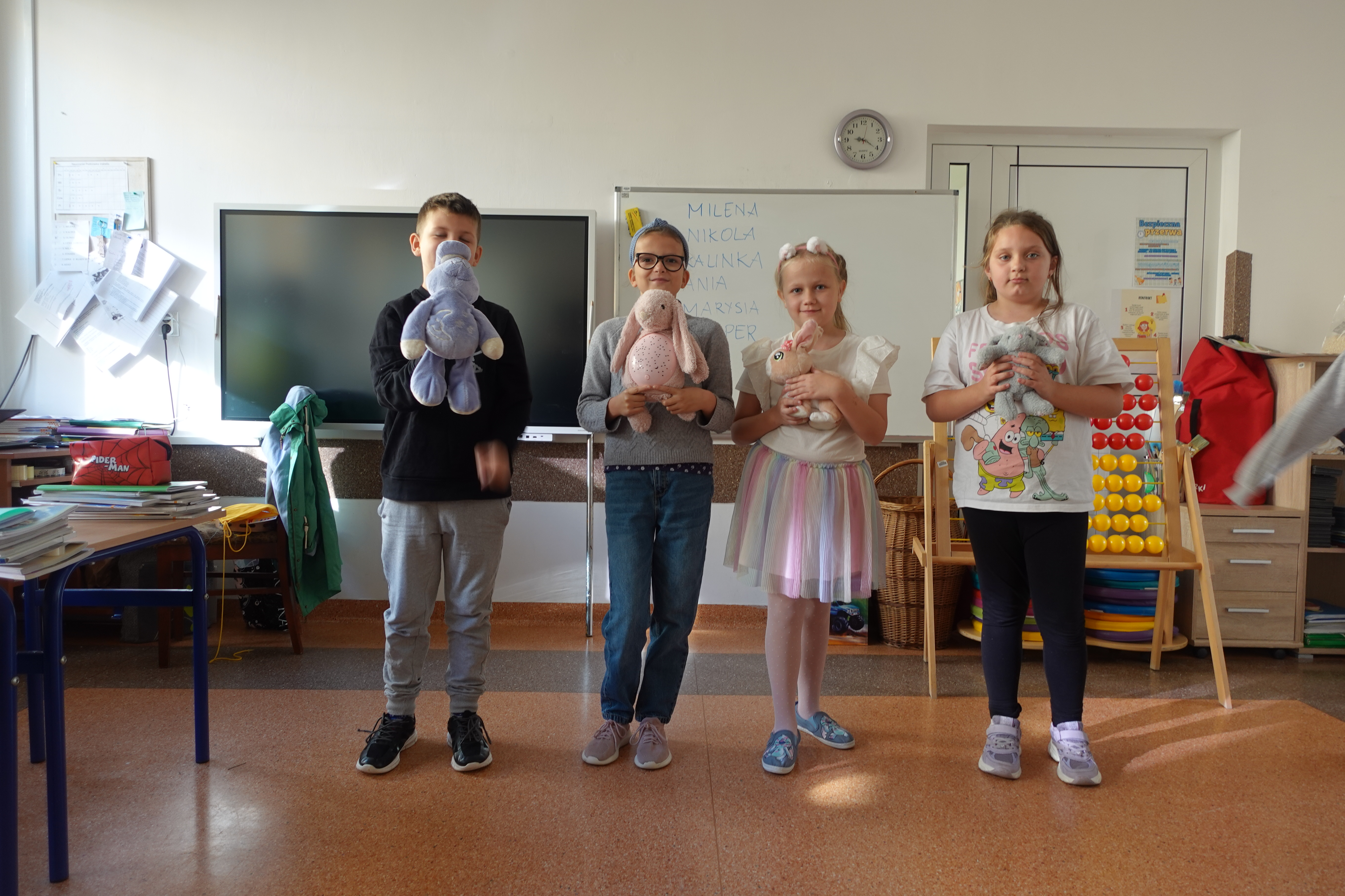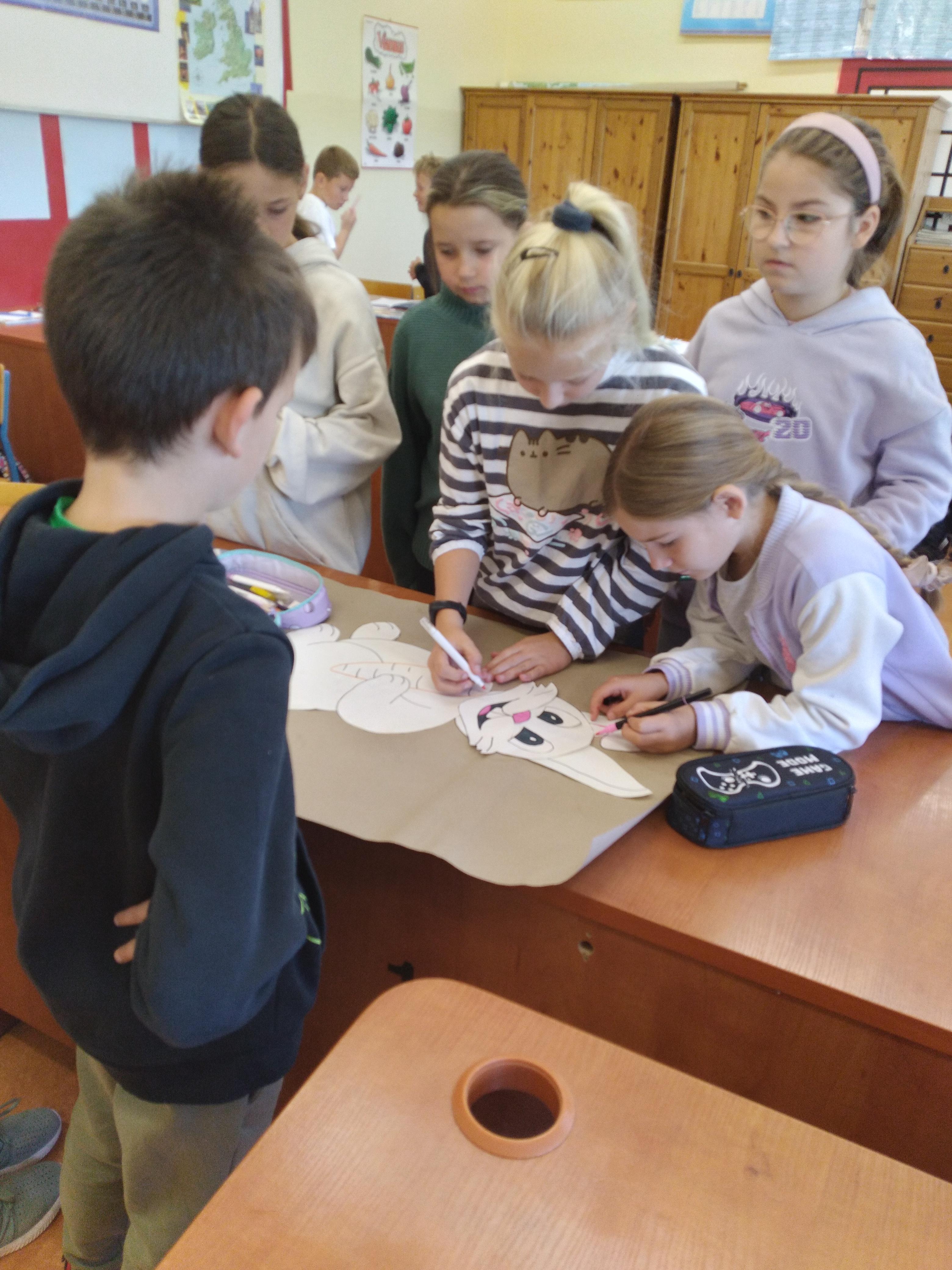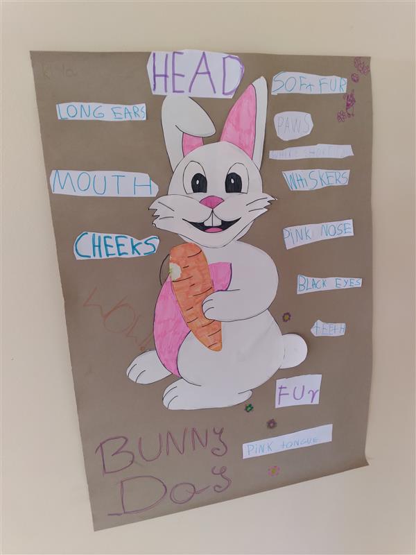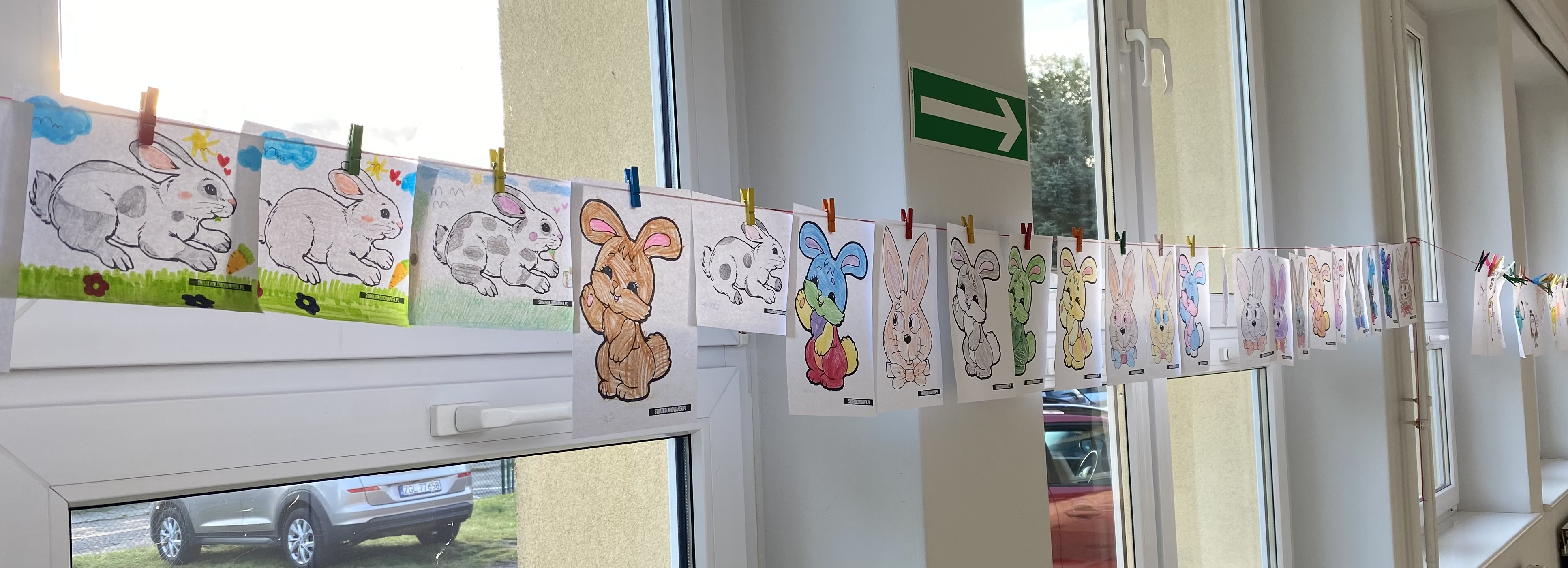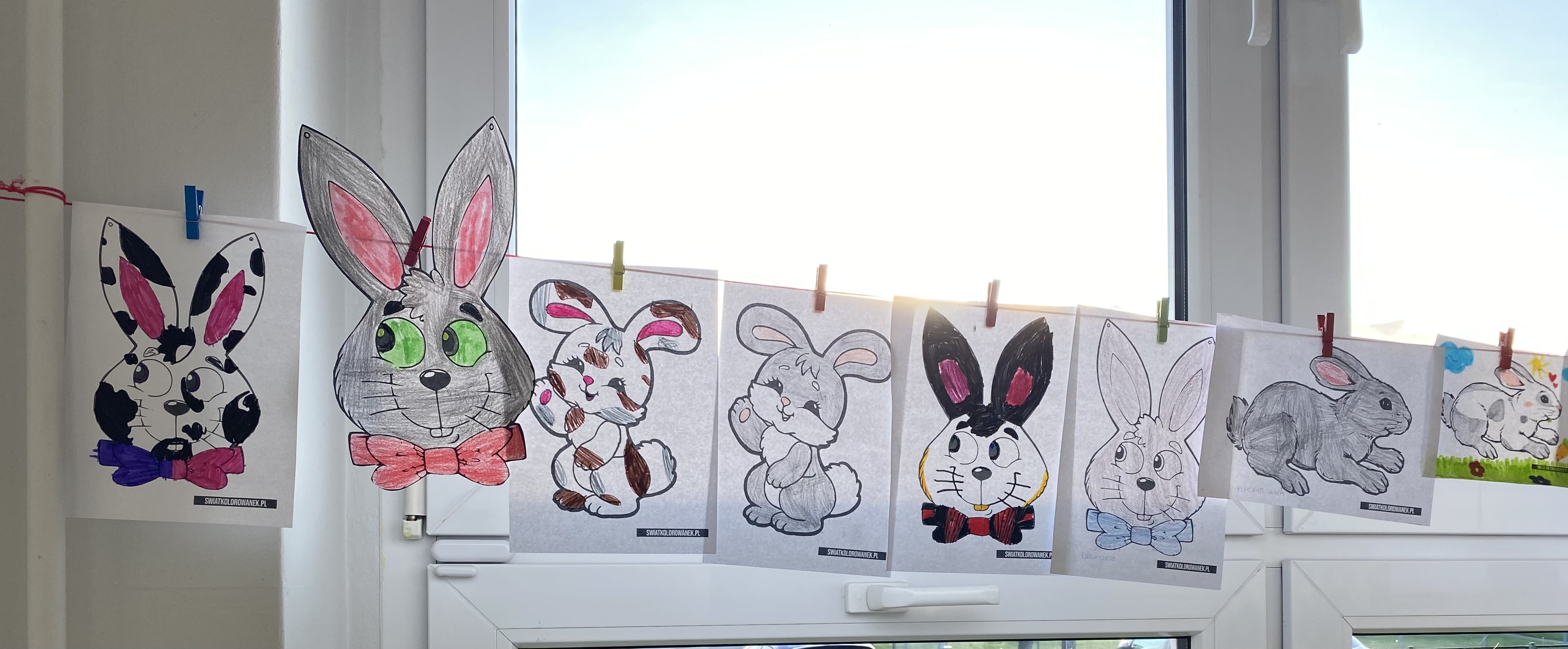 Była zabawa w poszukiwanie ciekawostek o tych zwierzątkach (wydawało się, że w zakamarkach korytarza ciężko będzie znaleźć karteczki z owymi ciekawostkami, ale nasze dzieci dysponują chyba szóstym zmysłem, albo króliczym węchem, bo ich znalezienie zajęło im dosłownie parę chwil!). Na lekcji języka angielskiego uczniowie klasy czwartej utrwalali nazwy części ciała, wykonując plakat o zabawnym króliczku. Były tak lubiane przez wszystkich kolorowanki. Jednak chyba największą atrakcję zapewnił nam Ksawery, który przyniósł do szkoły swojego Pioruna. Opowiedział o nim wiele ciekawych i zabawnych historyjek, poinstruował chętnych do posiadania królika, jak się nim zajmować, a na koniec pozwolił nawet pogłaskać swojego pupila.