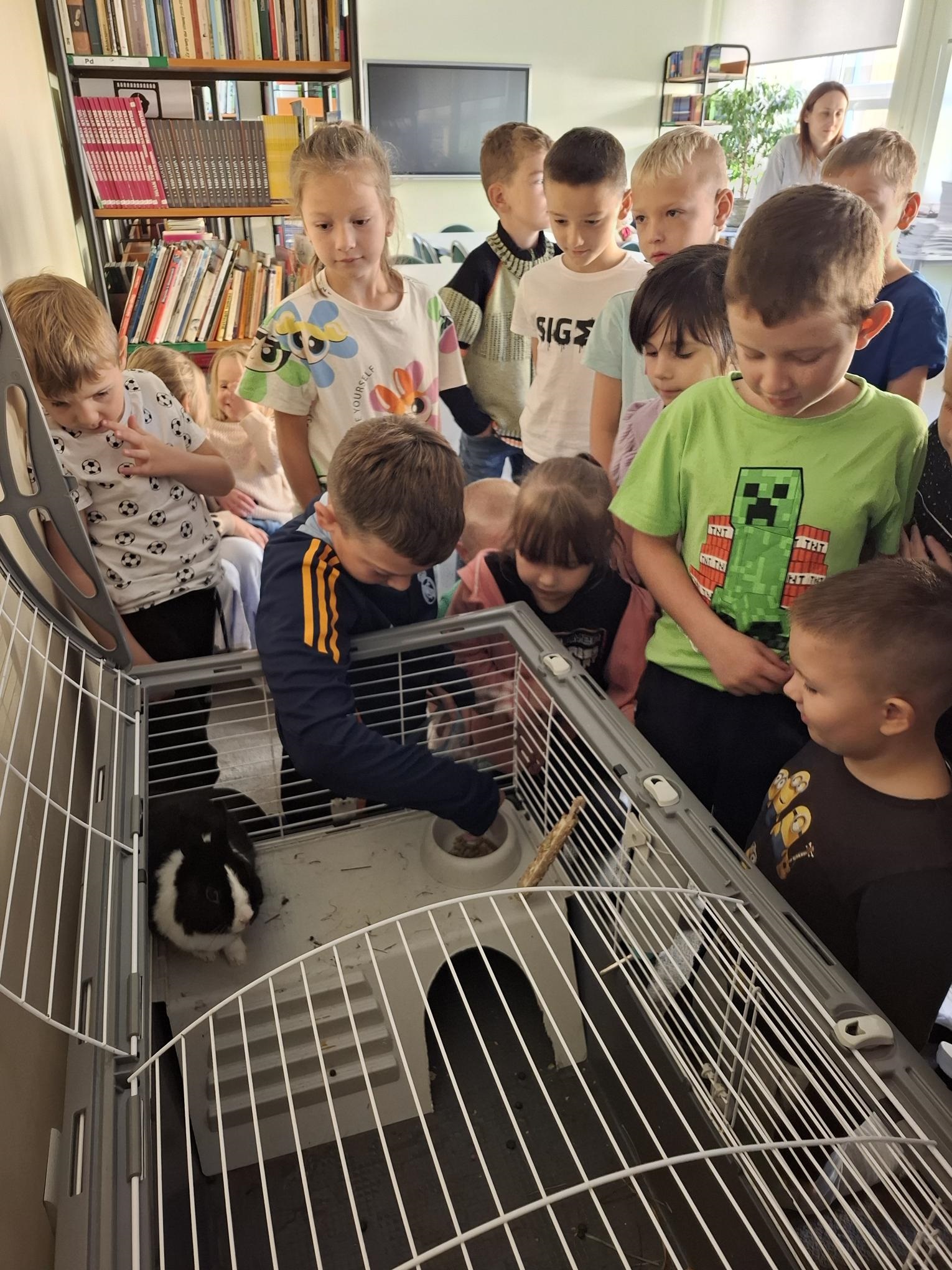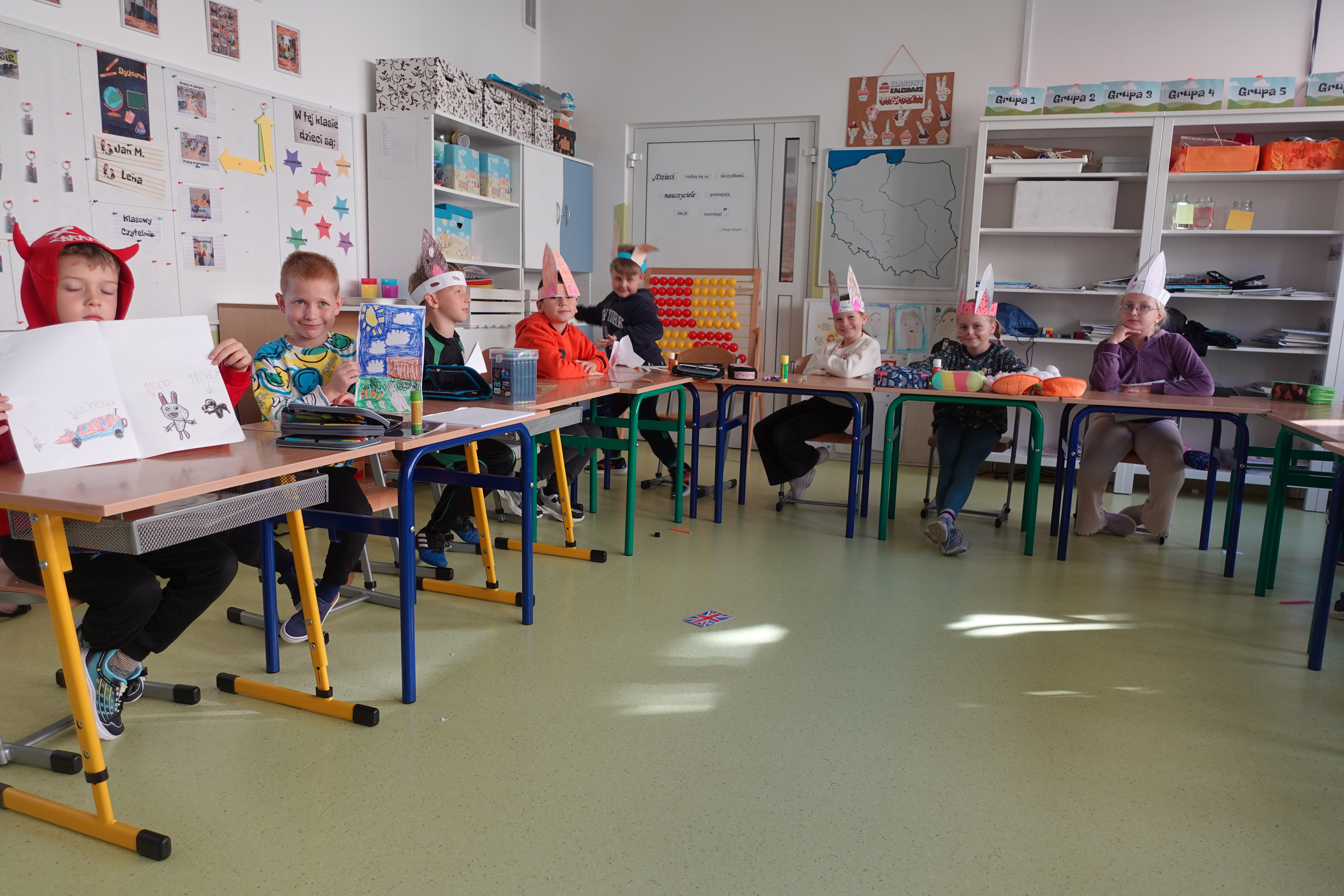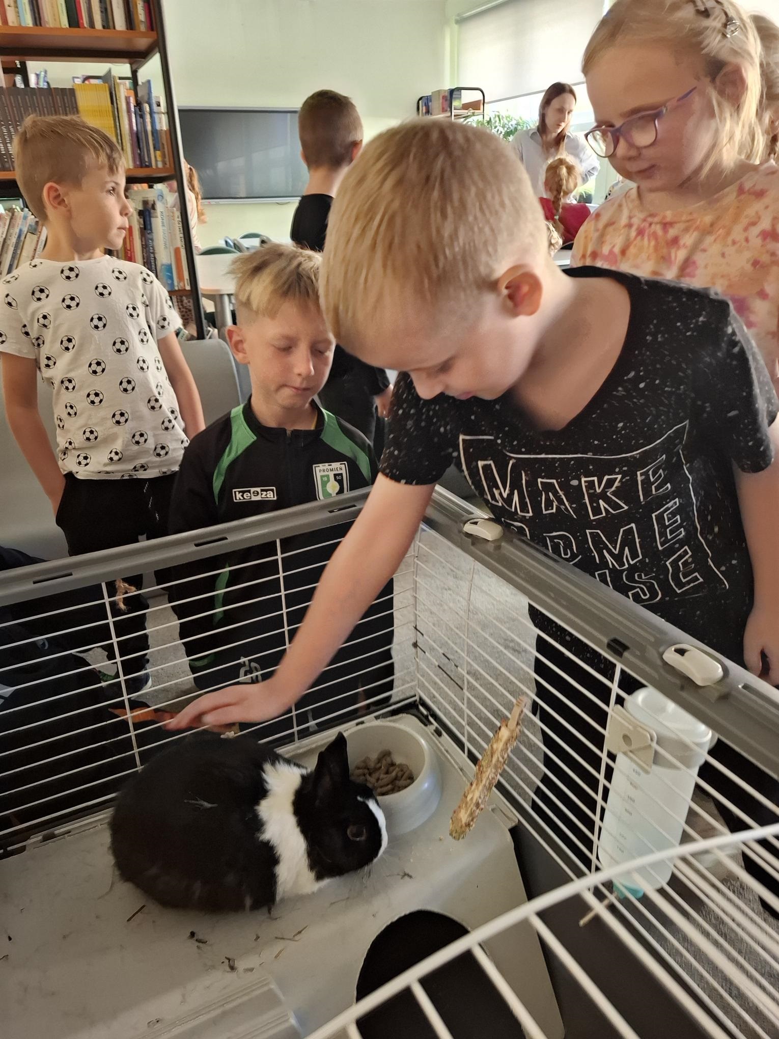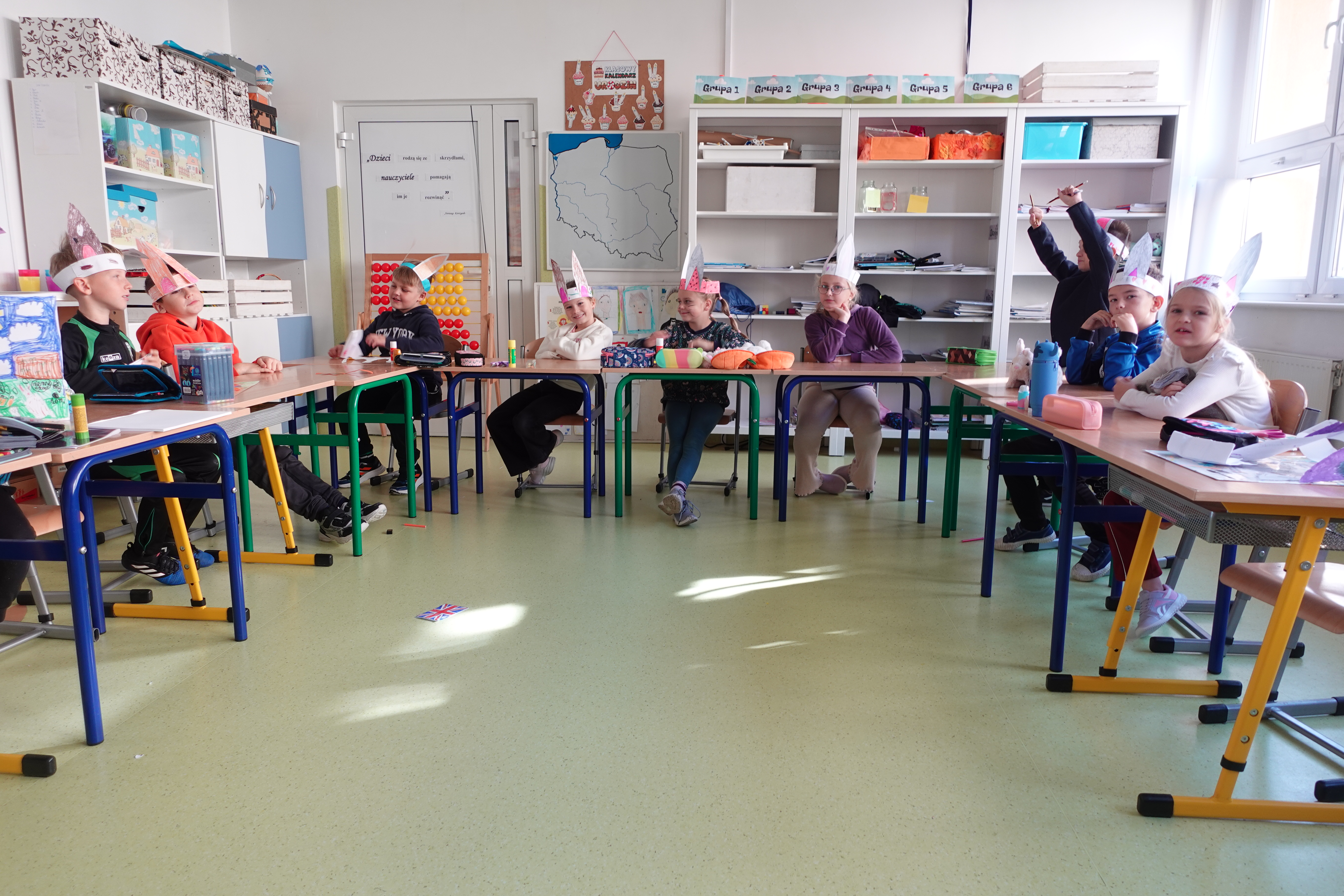 Była zabawa w poszukiwanie ciekawostek o tych zwierzątkach (wydawało się, że w zakamarkach korytarza ciężko będzie znaleźć karteczki z owymi ciekawostkami, ale nasze dzieci dysponują chyba szóstym zmysłem, albo króliczym węchem, bo ich znalezienie zajęło im dosłownie parę chwil!). Na lekcji języka angielskiego uczniowie klasy czwartej utrwalali nazwy części ciała, wykonując plakat o zabawnym króliczku. Były tak lubiane przez wszystkich kolorowanki. Jednak chyba największą atrakcję zapewnił nam Ksawery, który przyniósł do szkoły swojego Pioruna. Opowiedział o nim wiele ciekawych i zabawnych historyjek, poinstruował chętnych do posiadania królika, jak się nim zajmować, a na koniec pozwolił nawet pogłaskać swojego pupila.