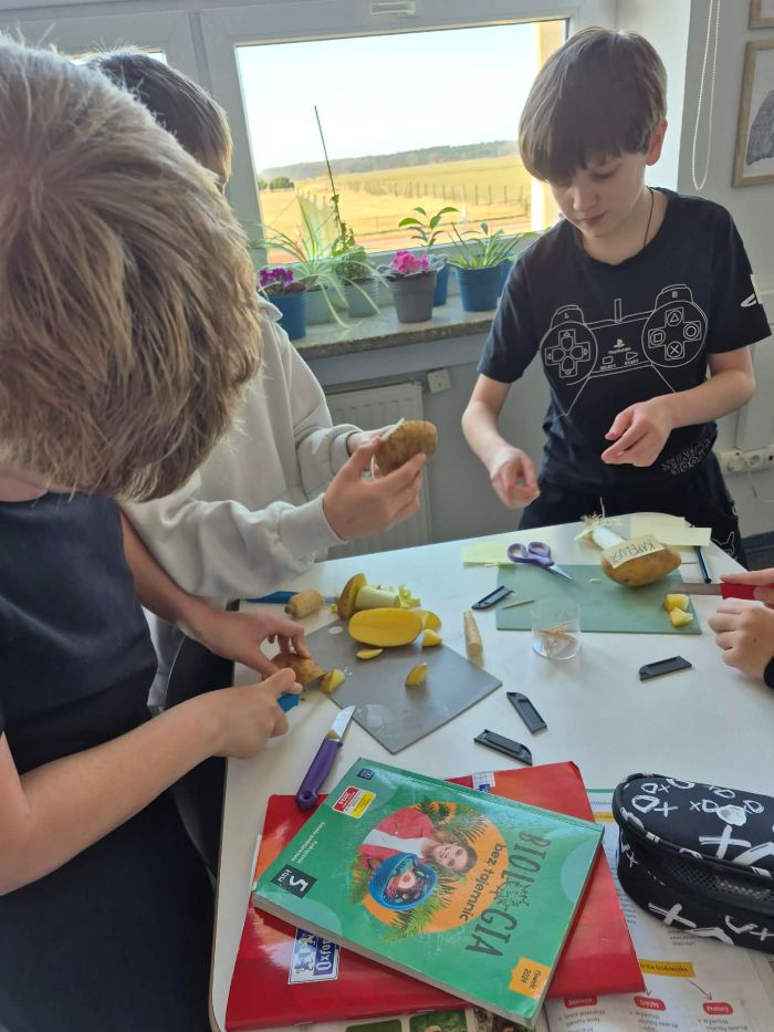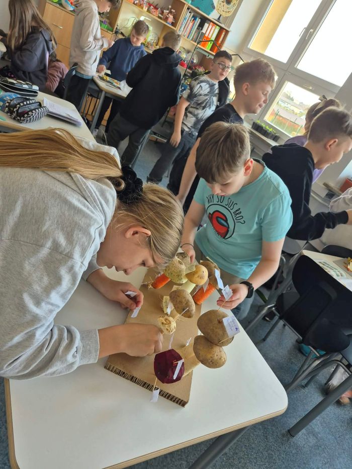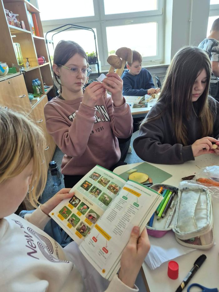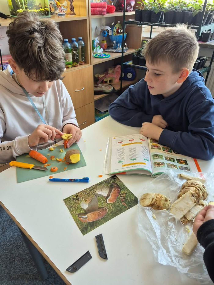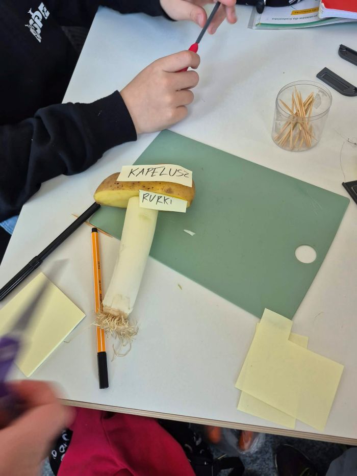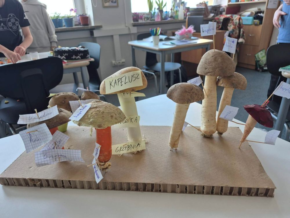 Uczniowie klasy piątej utrwalali wiadomości dotyczące budowy grzybów kapeluszowych oraz poznawali gatunki grzybów jadalnych i trujących. Podczas zajęć wykazali się dużą kreatywnością, wykonując eksponaty grzybów z warzyw przyniesionych z domu.