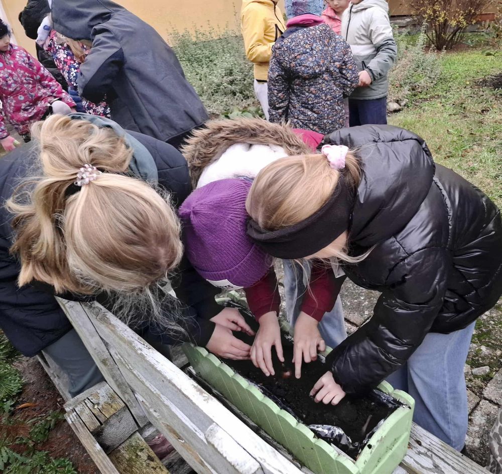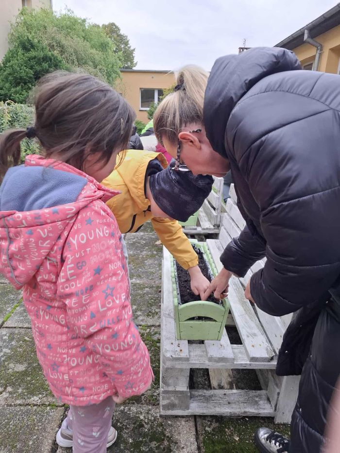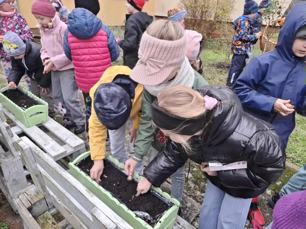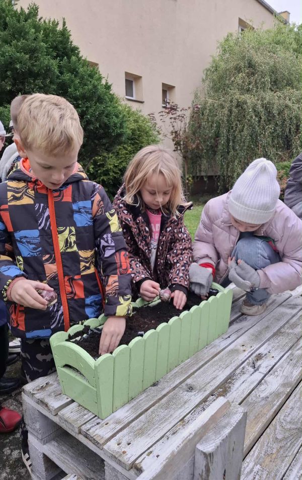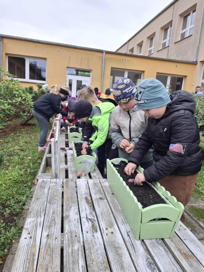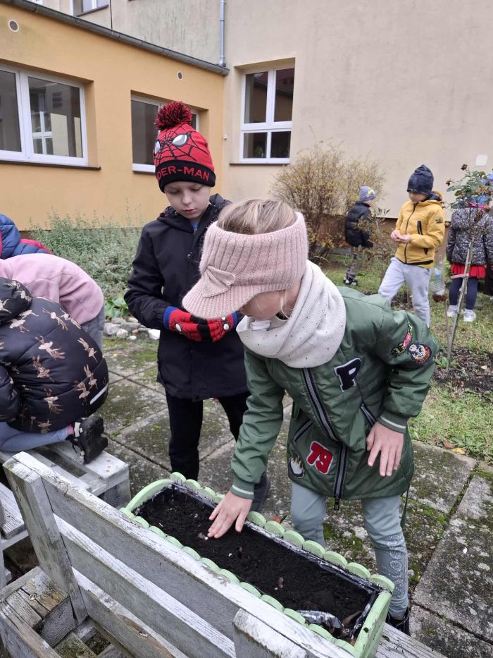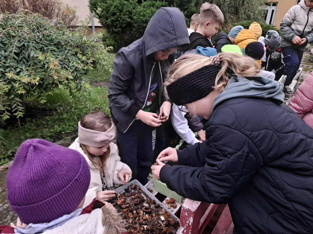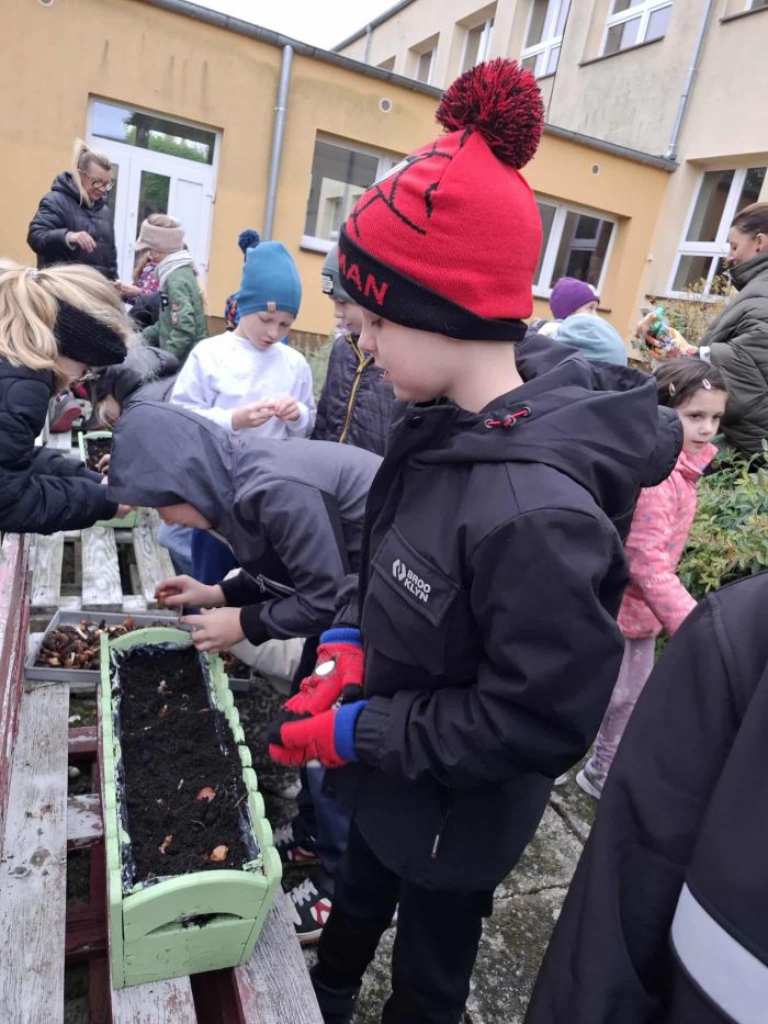 W dniu dzisiejszym, w ramach zajęć przyrodniczych, uczniowie klasy pierwszej i drugiej uczestniczyli w akcji sadzenia cebulek kwiatów. Dzieci najpierw zapoznały się z budową cebulek oraz warunkami potrzebnymi do ich wzrostu. Następnie współpracując ze sobą uczniowie posadzili cebulki różnych gatunków kwiatów, które wiosną ozdobią teren naszej szkoły.
