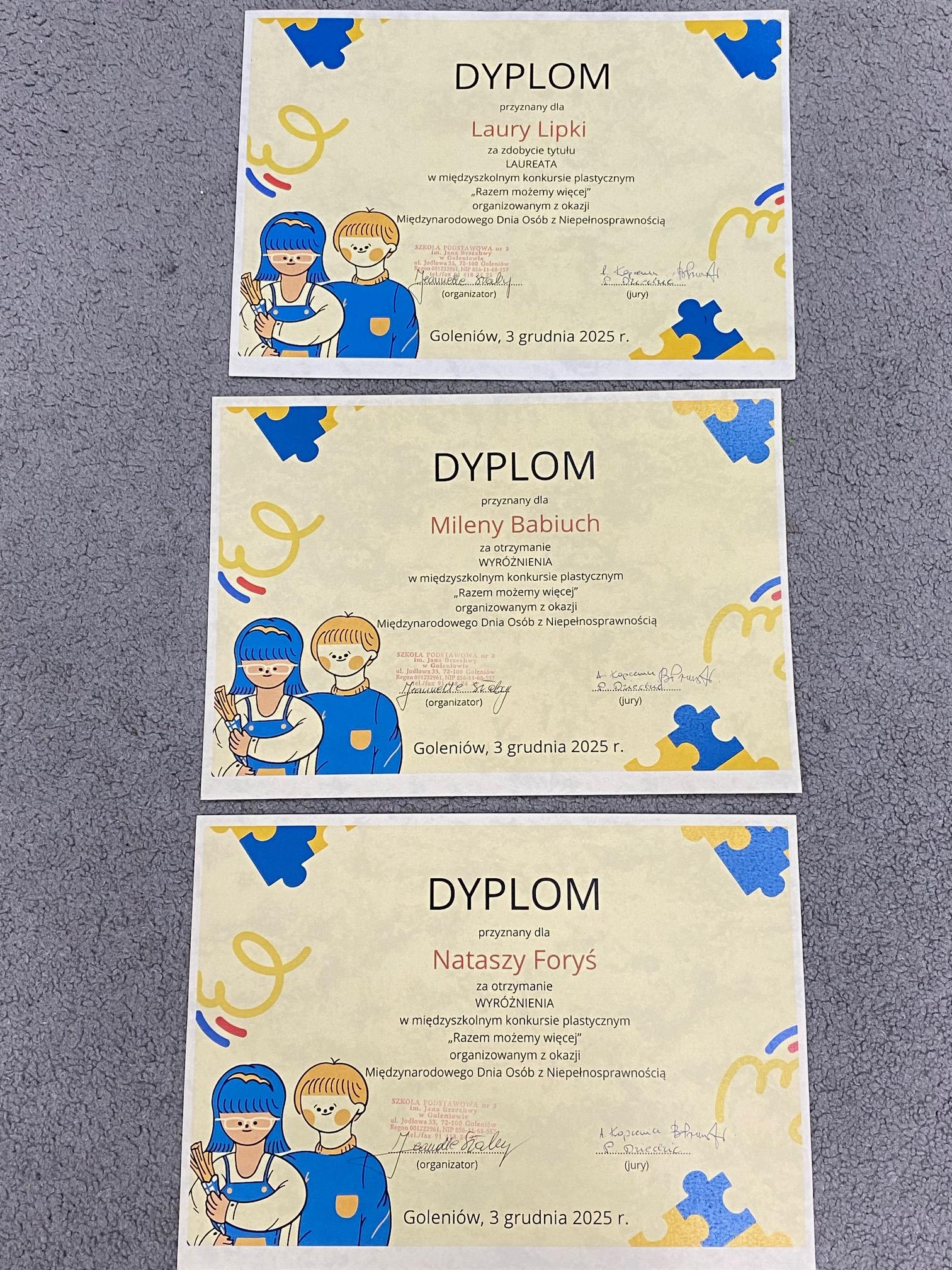 Uczniowie klas trzecich mogli wziąć udział w międzyszkolnym konkursie plastycznym ogłoszonym przez Szkołę Podstawową nr 3 w Goleniowie na temat "Razem możemy więcej", a zorganizowanym z okazji Międzynarodowego Dnia Osób z Niepełnosprawnością. Tytuł Laureata zdobyła Laura Lipka, wyróżnienia otrzymały Milena Babiuch i Natasza Foryś. Gratulujemy, Dziewczyny!