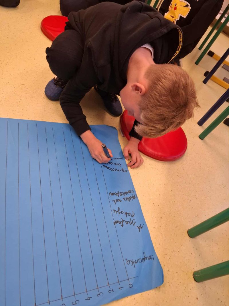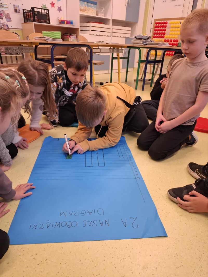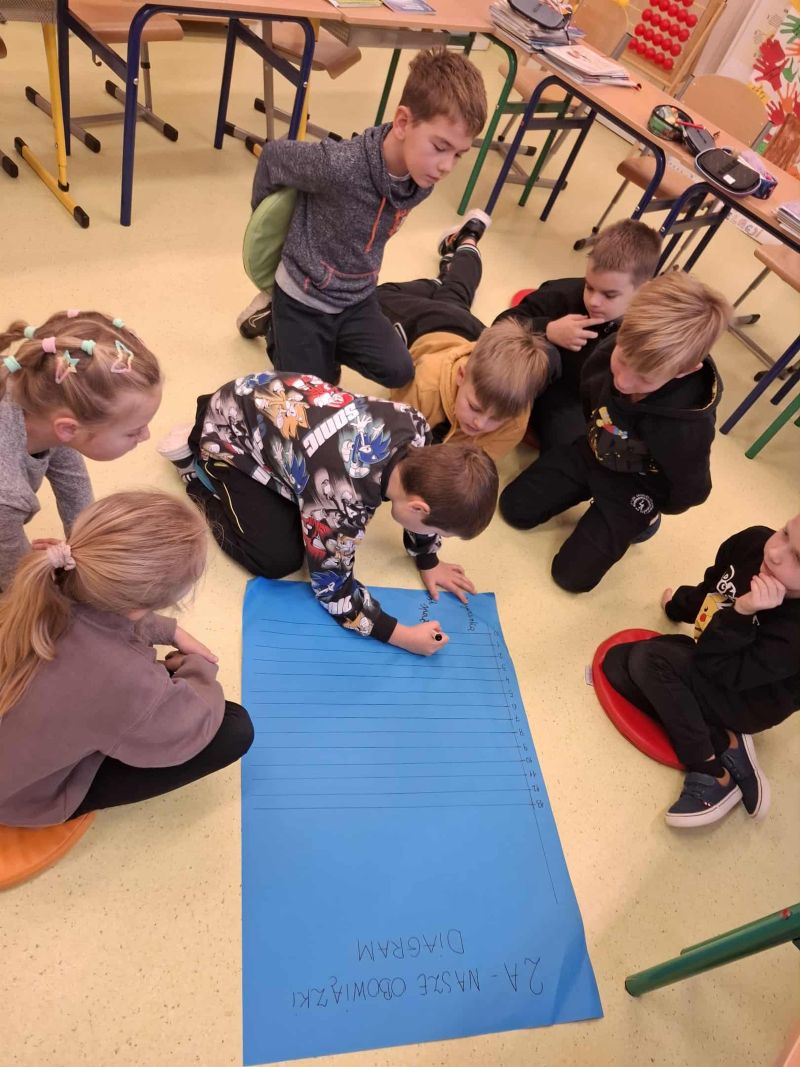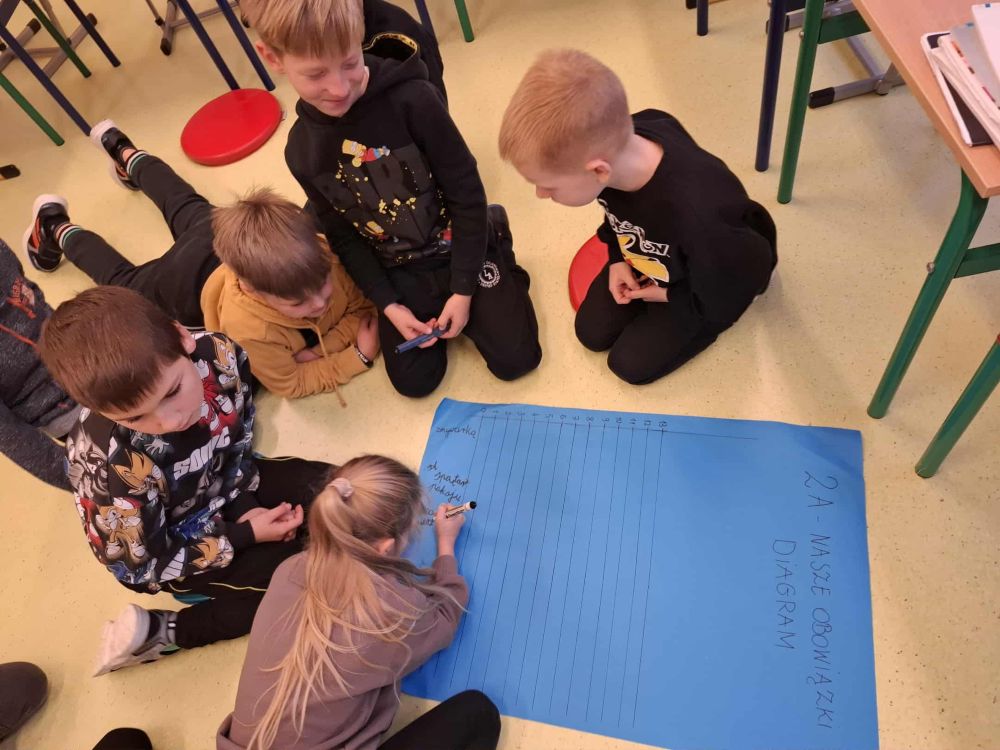 Na ostatnich zajęciach drugoklasiści tworzyli diagram słupkowy przedstawiający ich obowiązki domowe. Najpierw uczniowie zebrali dane, następnie zapisali je w tabeli. Kolejnym etapem było przedstawienie danych na diagramie słupkowym - każdy słupek miał wysokość odpowiadającą liczbie uczniów. Poprzez wspólne działania uczniowie: