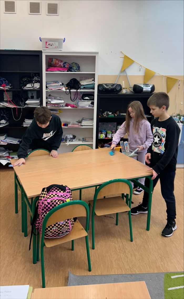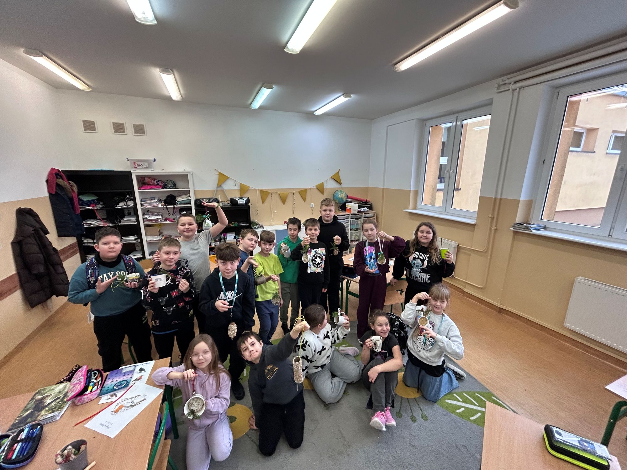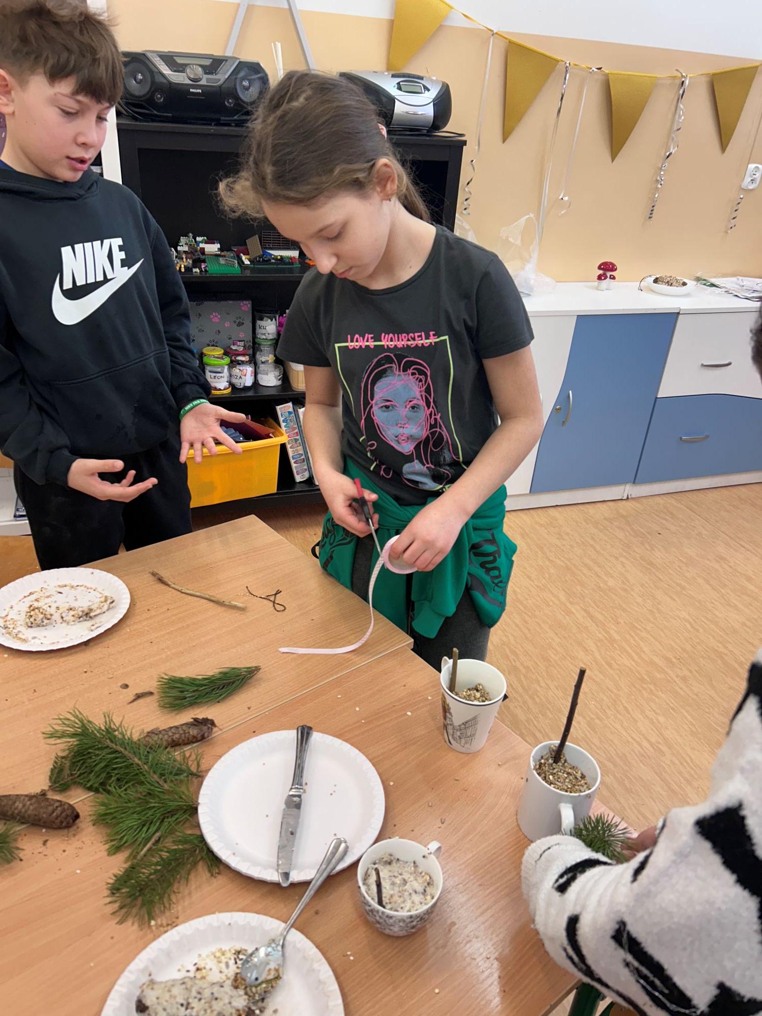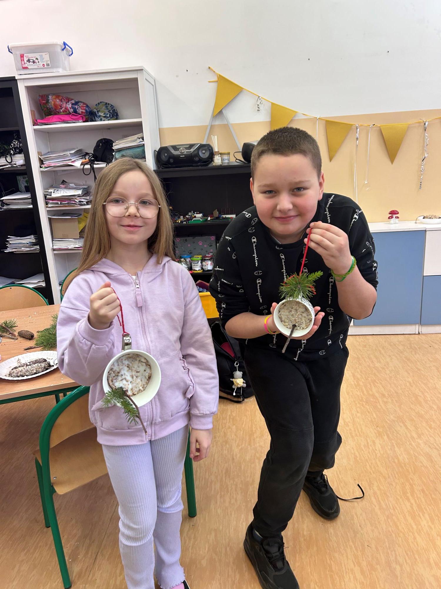 Uczniowie klasy 3a w ramach zajęć „Przyjaciel zza okna – ptaki” realizowali ekologiczną klasową inicjatywę, podczas której własnoręcznie wykonali karmniki oraz przygotowali naturalną karmę dla ptaków. Do jej stworzenia wykorzystali wybrane produkty, m.in. smalec, kaszę, nasiona słonecznika oraz płatki owsiane. Uczniowie zdobyli również wiedzę na temat prawidłowego dokarmiania ptaków, poznali gatunki pozostające w Polsce na zimę oraz ciekawostki dotyczące zachowań ptaków, w tym wybrane tańce godowe. Zajęcia rozwijały postawy ekologiczne, wrażliwość na przyrodę i odpowiedzialność za środowisko.