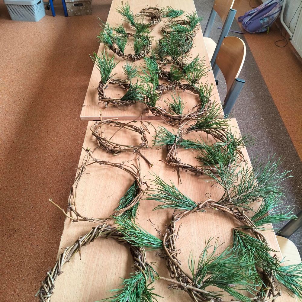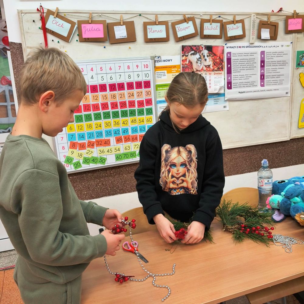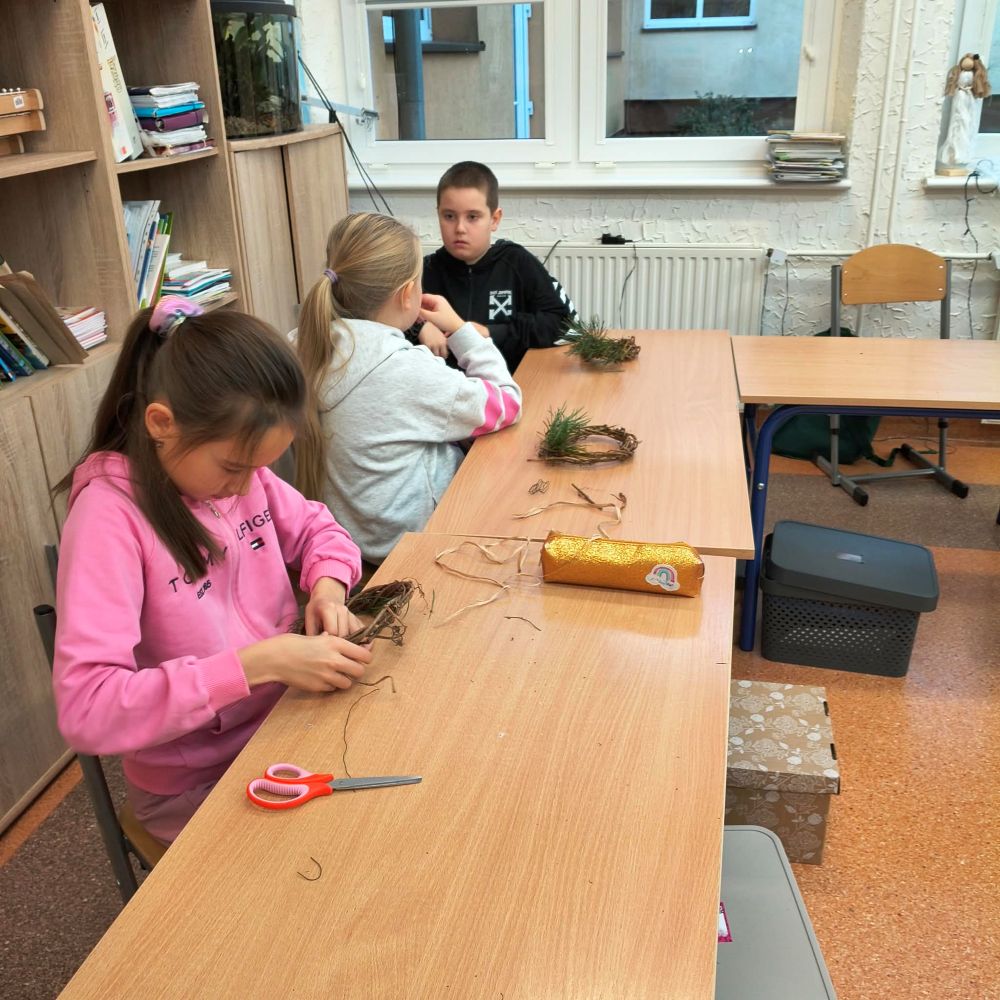 Z okazji Świąt Bożego Narodzenia uczniowie klasy 3B wykonali świąteczne wianki. Nie było to łatwe zadanie. Korzystając z materiałów naturalnych najpierw, każdy uplótł wianek. Następnie przyozdobił gałązkami z drzew iglastych. Kolejnego dnia odbyło się dekorowanie ozdobami świątecznymi. Pracy było dużo, ale efekt zdumiewający.