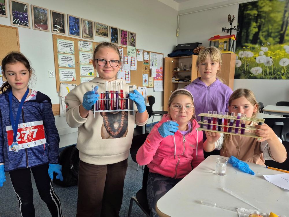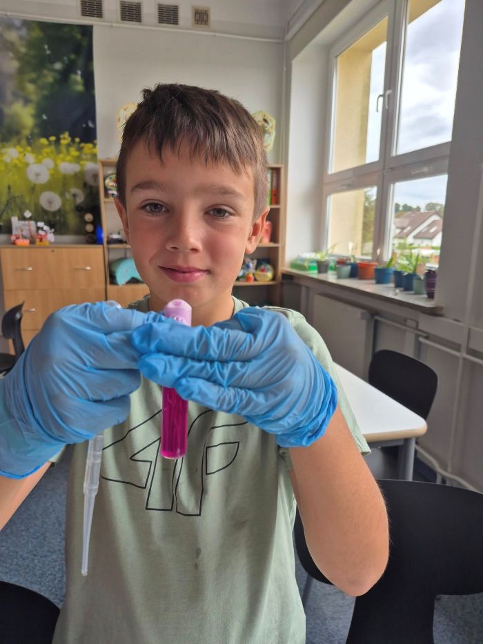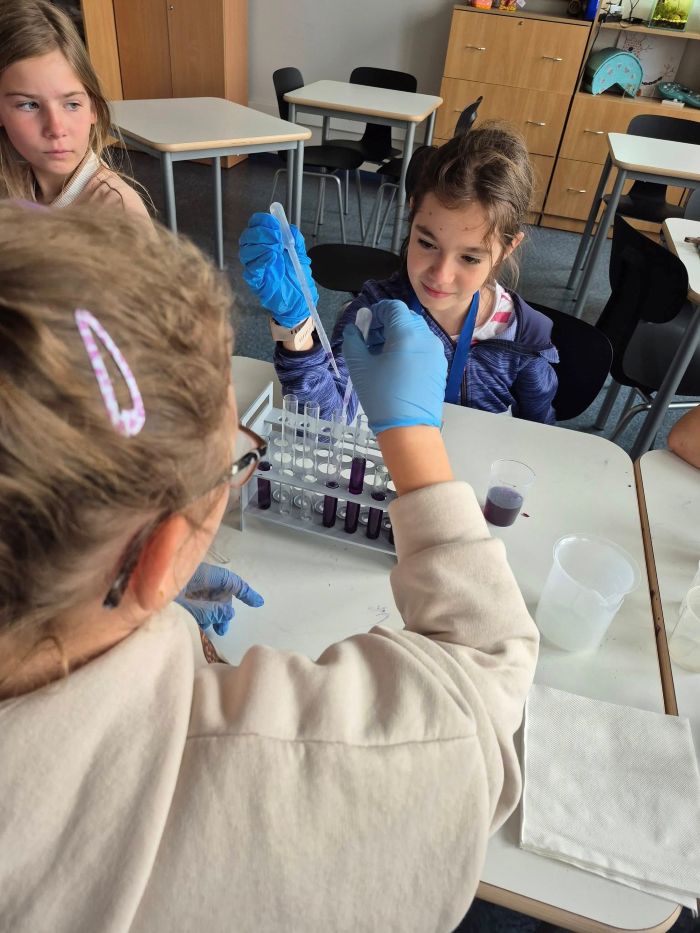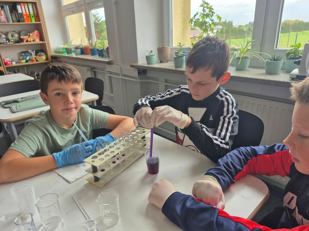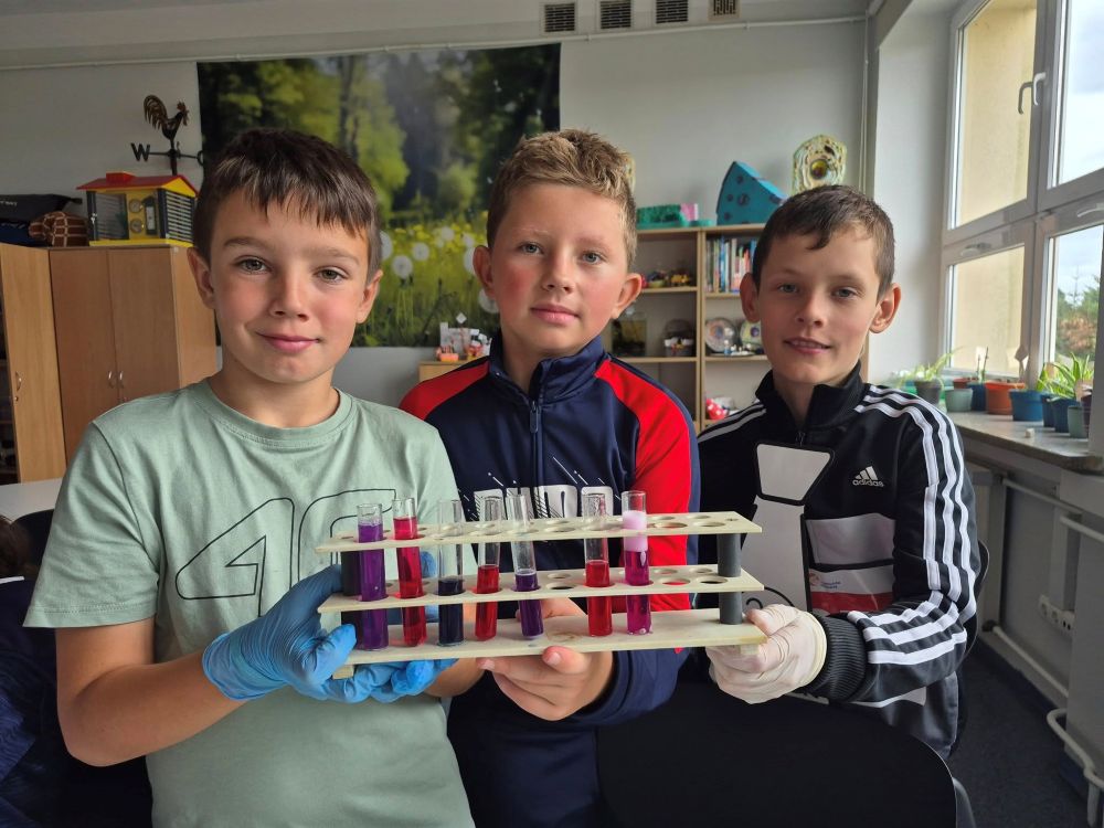z wykorzystaniem naturalnego wskaźnika, jakim jest sok z czerwonej kapusty. Uczniowie badali kwasowość i zasadowość różnych substancji, takich jak ocet, sok z cytryny, soda czy proszek do pieczenia. Efektem były kolorowe probówki, które pokazały, że nauka może być fascynującą zabawą! To dopiero początek naszej przygody z biologią i turystyką – przed nami wiele eksperymentów i odkryć.