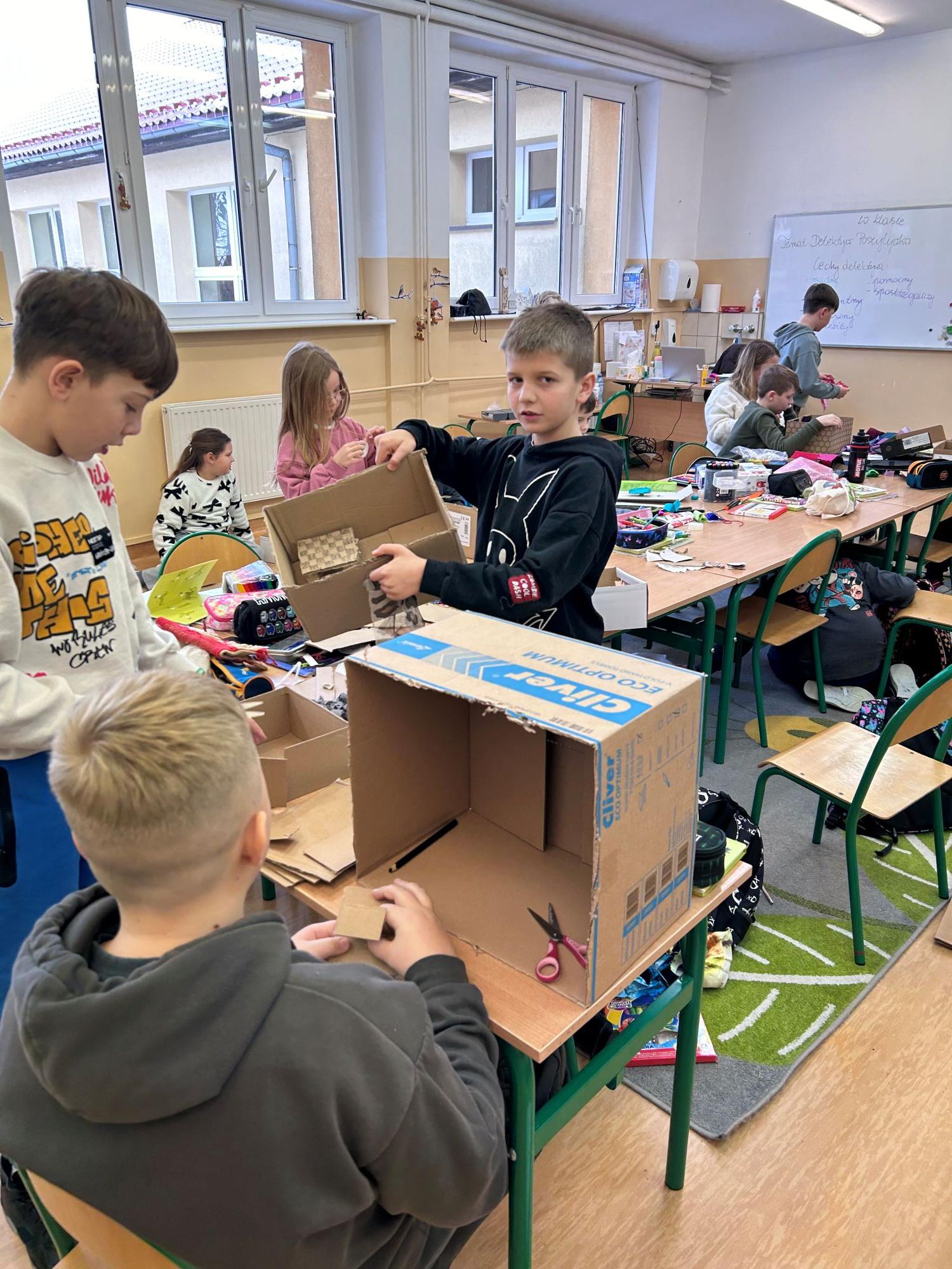 Detektyw Pozytywka stał się tematem nie jednego dnia w klasie 3a. Uczniowie omawiając lekturę zamienili się w detektywów szukając ukrytych zagadek, dodatkowo rozwiązywali quizy wiedzy oraz stworzyli własne biuro detektywistyczne „Różowe Okulary”. Kartonowe makiety zostały zaprezentowane i podziwiane przez całą klasę.