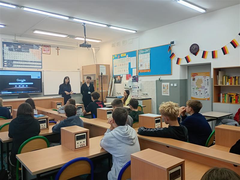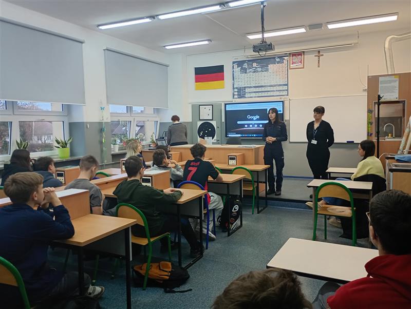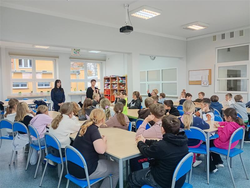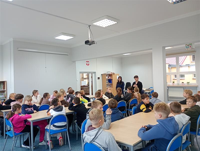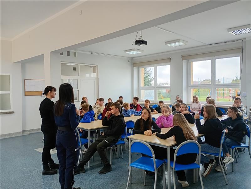 W dniu 17 listopada w naszej szkole odbyło się spotkanie z przedstawicielkami lokalnej policji – paniami P. Tychulską i P. Stawirej. W wydarzeniu uczestniczyli uczniowie klas IV–VIII.