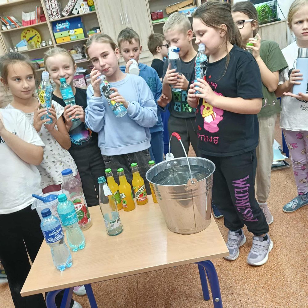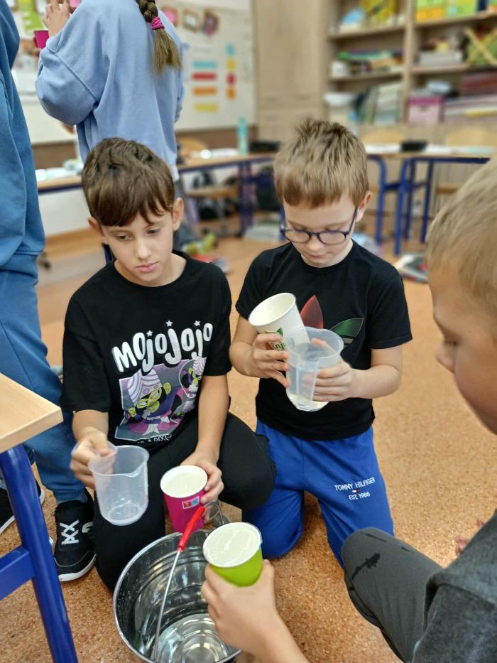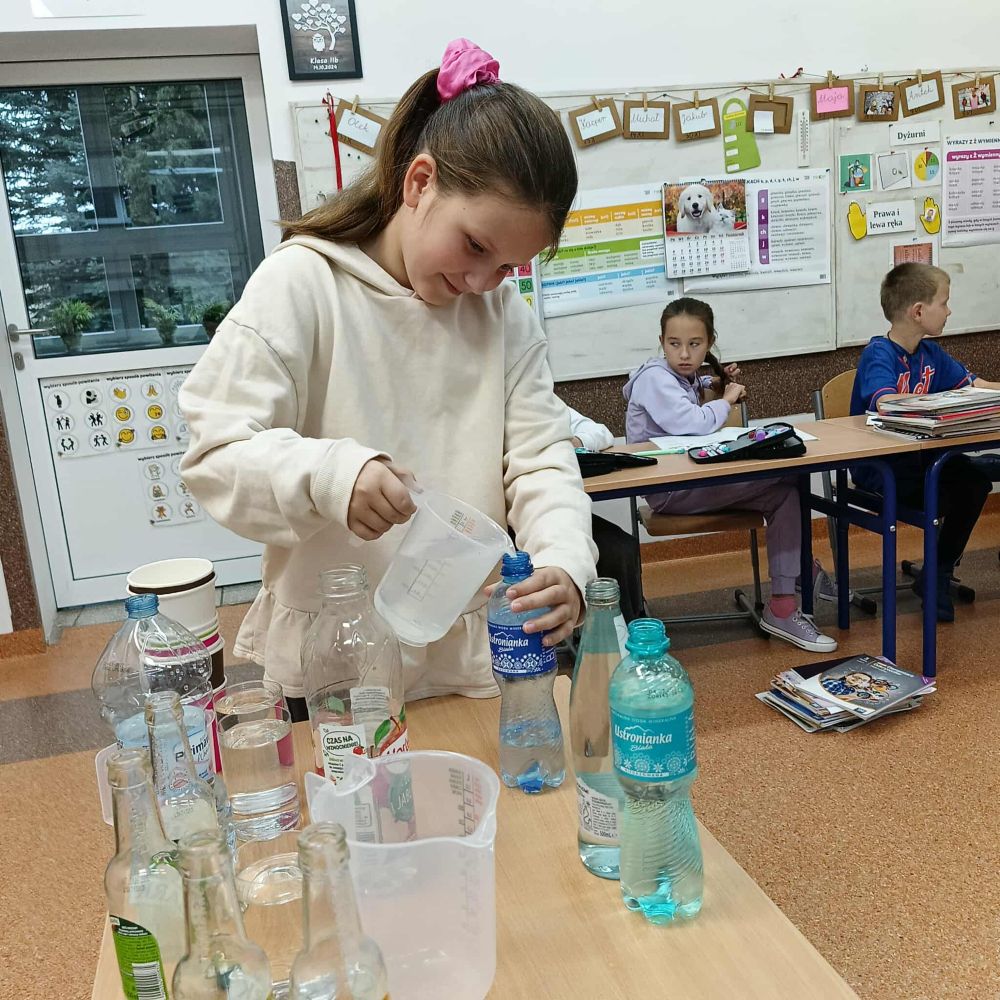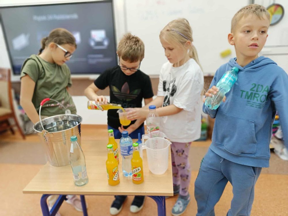 Kolejny raz uczniowie klasy 3B utrwalali wiadomości i umiejętności matematyczne poprzez działania praktyczne. Po zgromadzeniu potrzebnych naczyń, każdy mógł bawić się w odmierzanie odpowiednich ilości płynów. Najwięcej trudności sprawiło ćwierć litra, zarówno w praktyce jak i wymowie. Zachętą do działań był sok Tymbarka w butelkach ćwierćlitrowych, którego każdy mógł skosztować.