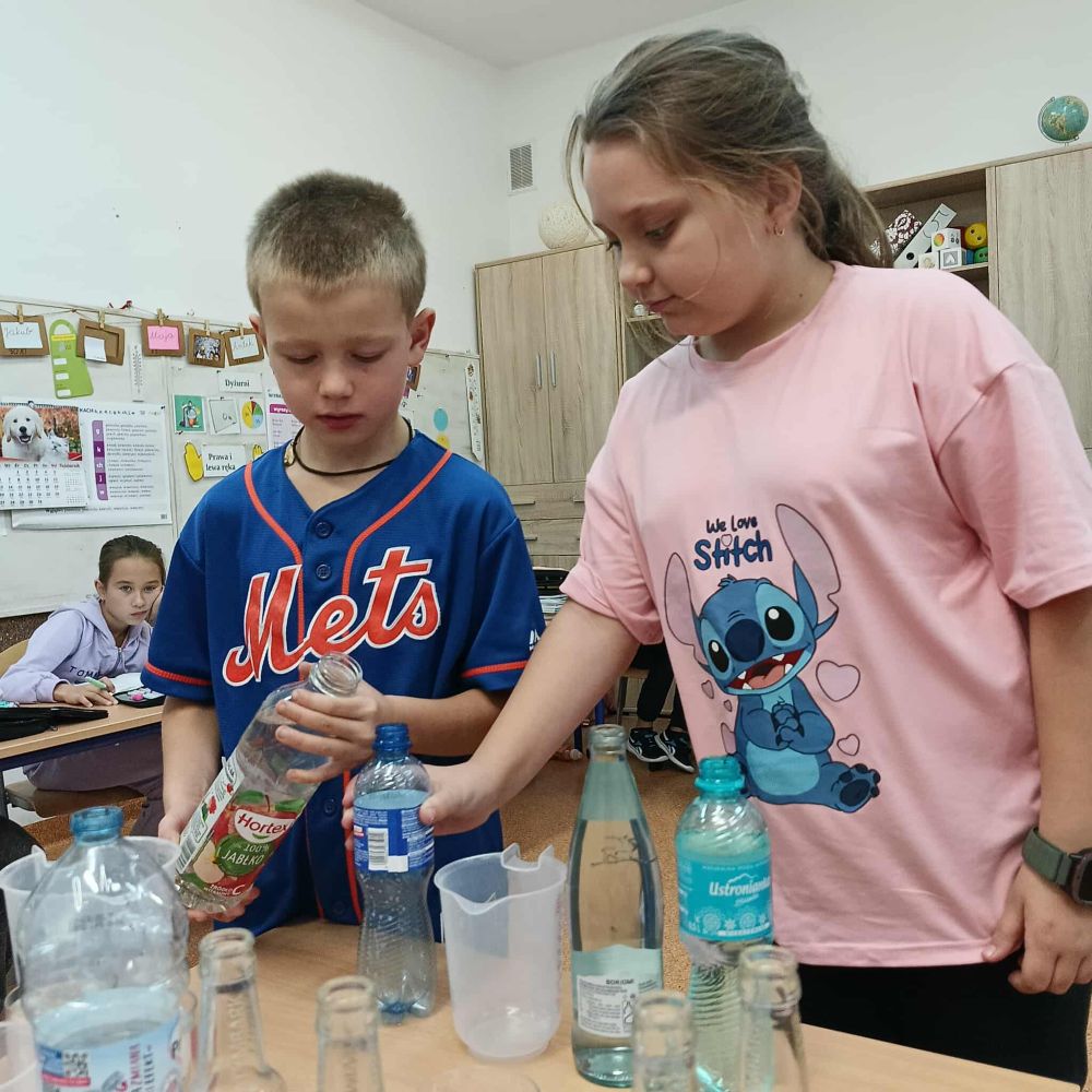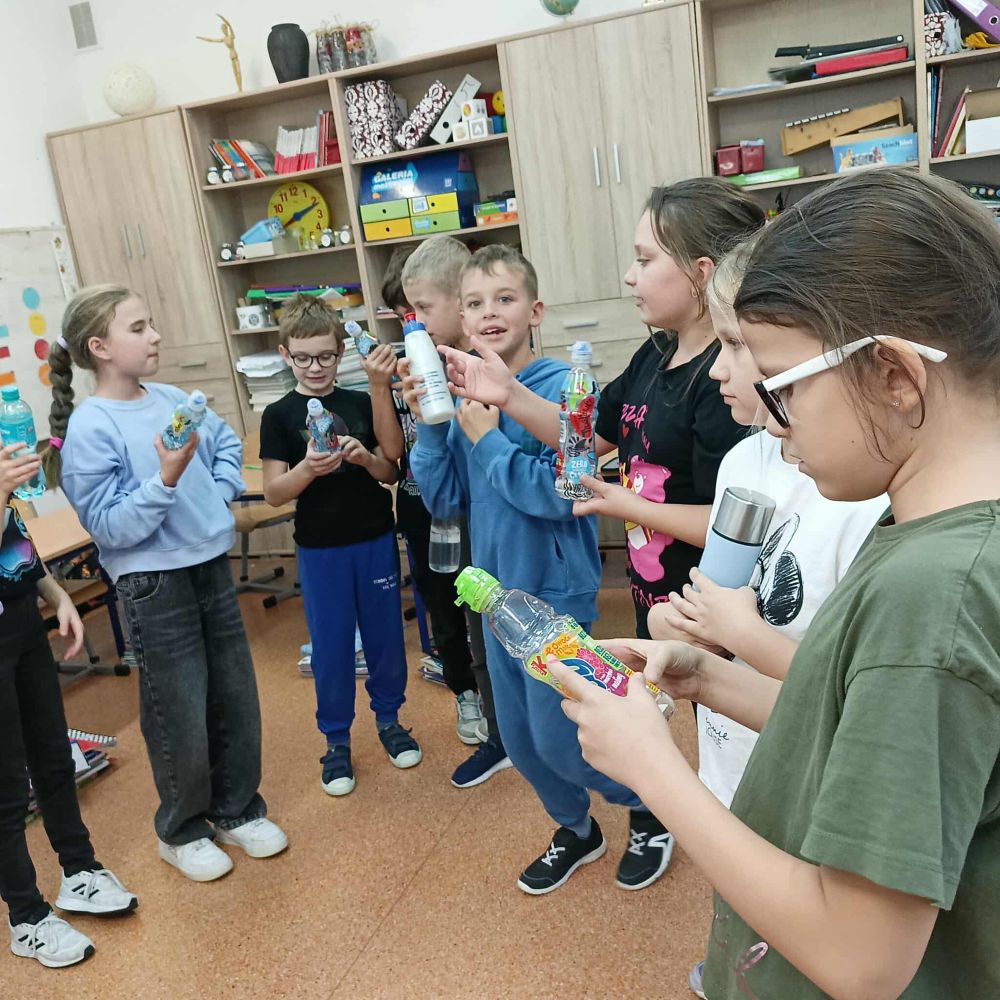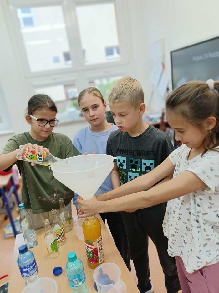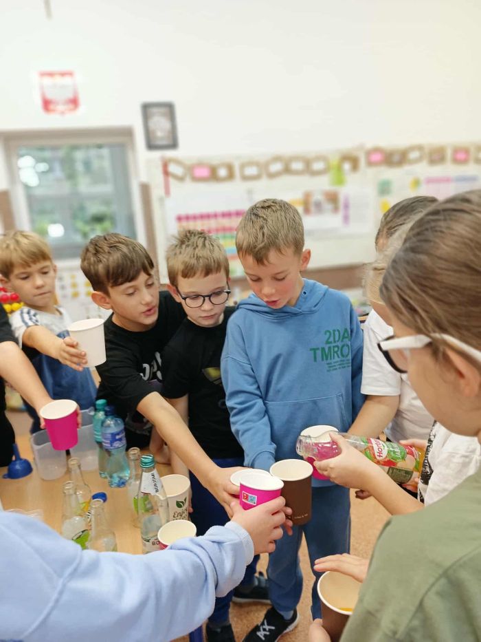 Kolejny raz uczniowie klasy 3B utrwalali wiadomości i umiejętności matematyczne poprzez działania praktyczne. Po zgromadzeniu potrzebnych naczyń, każdy mógł bawić się w odmierzanie odpowiednich ilości płynów. Najwięcej trudności sprawiło ćwierć litra, zarówno w praktyce jak i wymowie. Zachętą do działań był sok Tymbarka w butelkach ćwierćlitrowych, którego każdy mógł skosztować.
