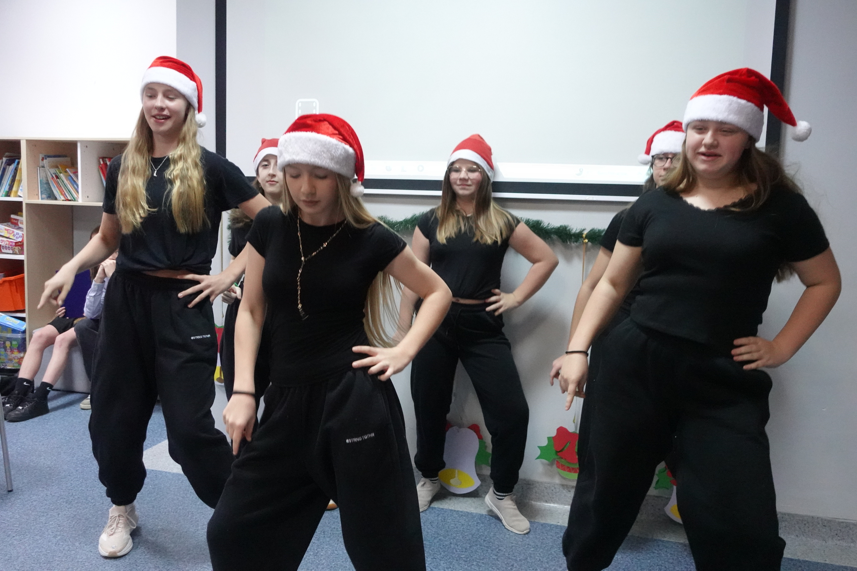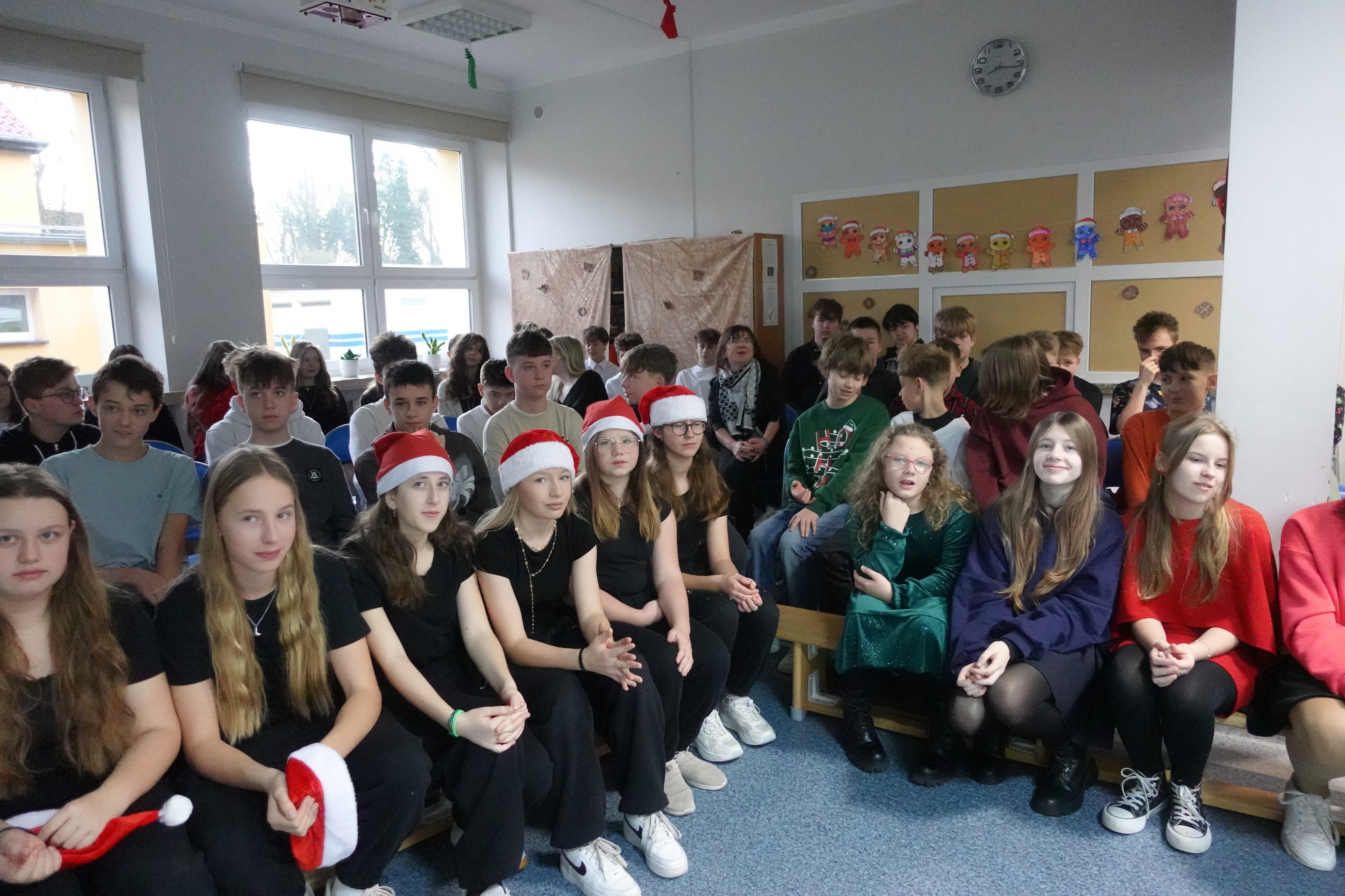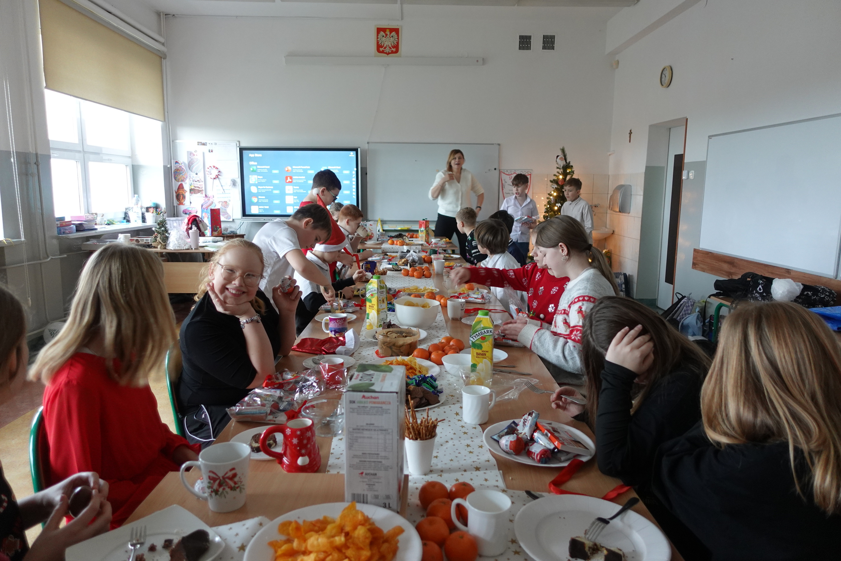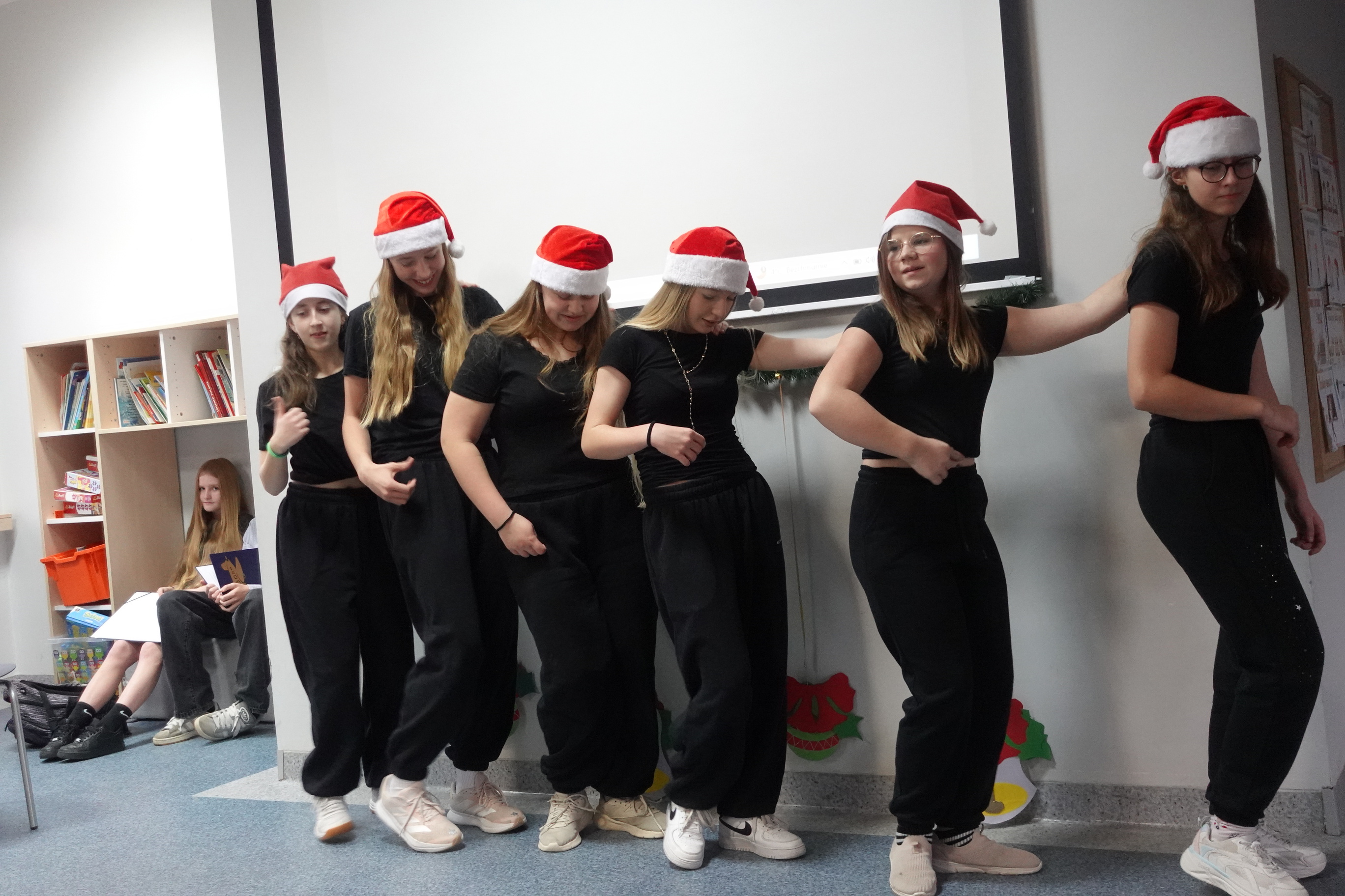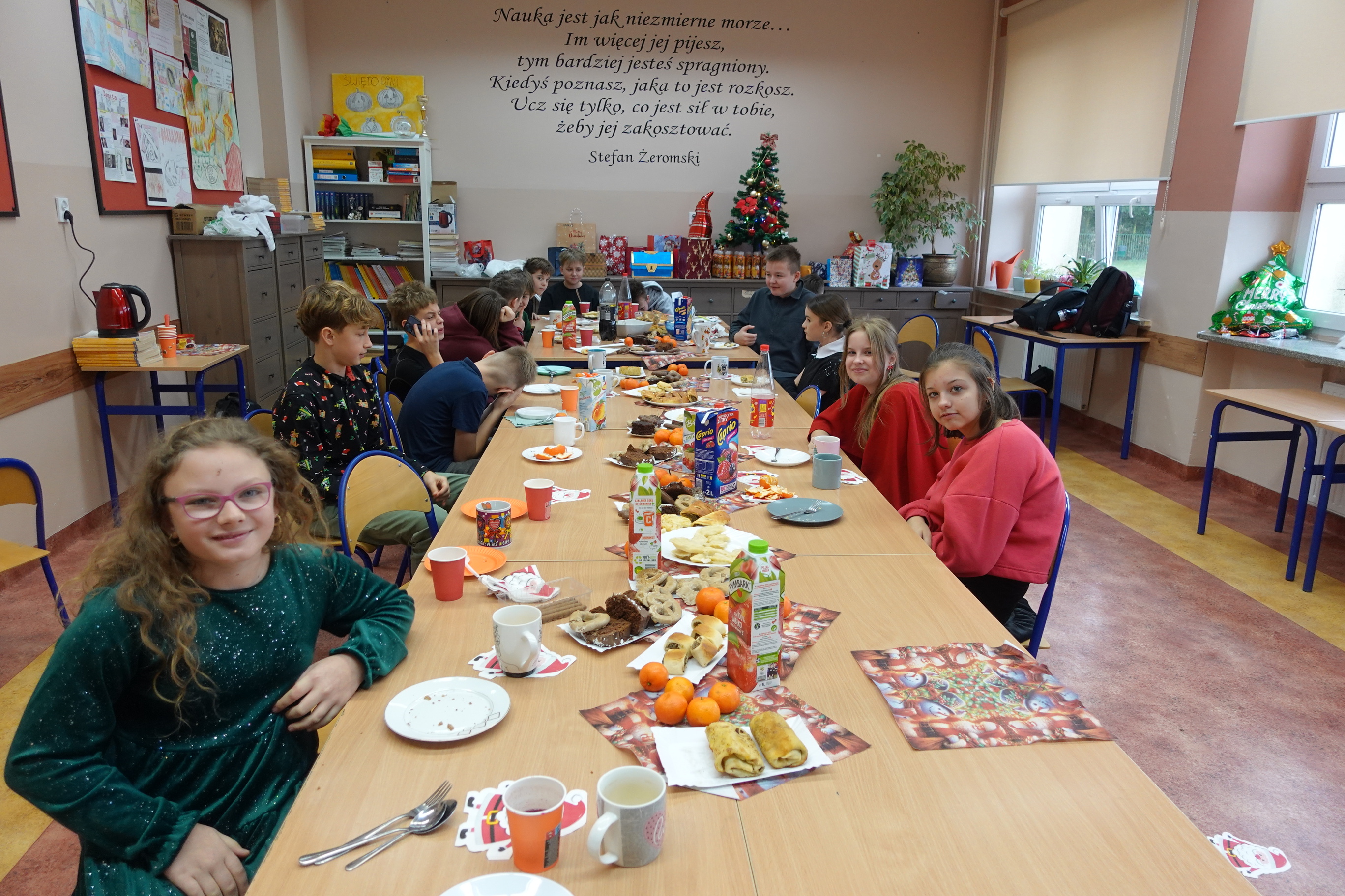 Na pierwszej lekcji uczniowie klas 4-8 zaśpiewali nam kilka „choinkowych” piosenek, a dziewczyny z klasy 7 zaprezentowały swój układ taneczny, wprowadzając nas w świąteczny nastrój. Po wspólnym kolędowaniu, chłopcy z drużyn piłkarskich pokazali nam swoje talenty w turnieju piłki nożnej. Po tych rozgrywkach uczniowie wraz z nauczycielami udali się do swoich klas, by wspólnie usiąść do stołu wigilijnego. Po uroczystym posiłku szkolna społeczność wzięła udział w świątecznym quzie z różnych dziedzin. Po udanej rywalizacji klasy 5, 7 oraz 8 udały się na świetlicę obejrzeć wspólnie „Baranka Shauna”. Był to ostatni dzień w szkole, widzimy się dopiero za rok.