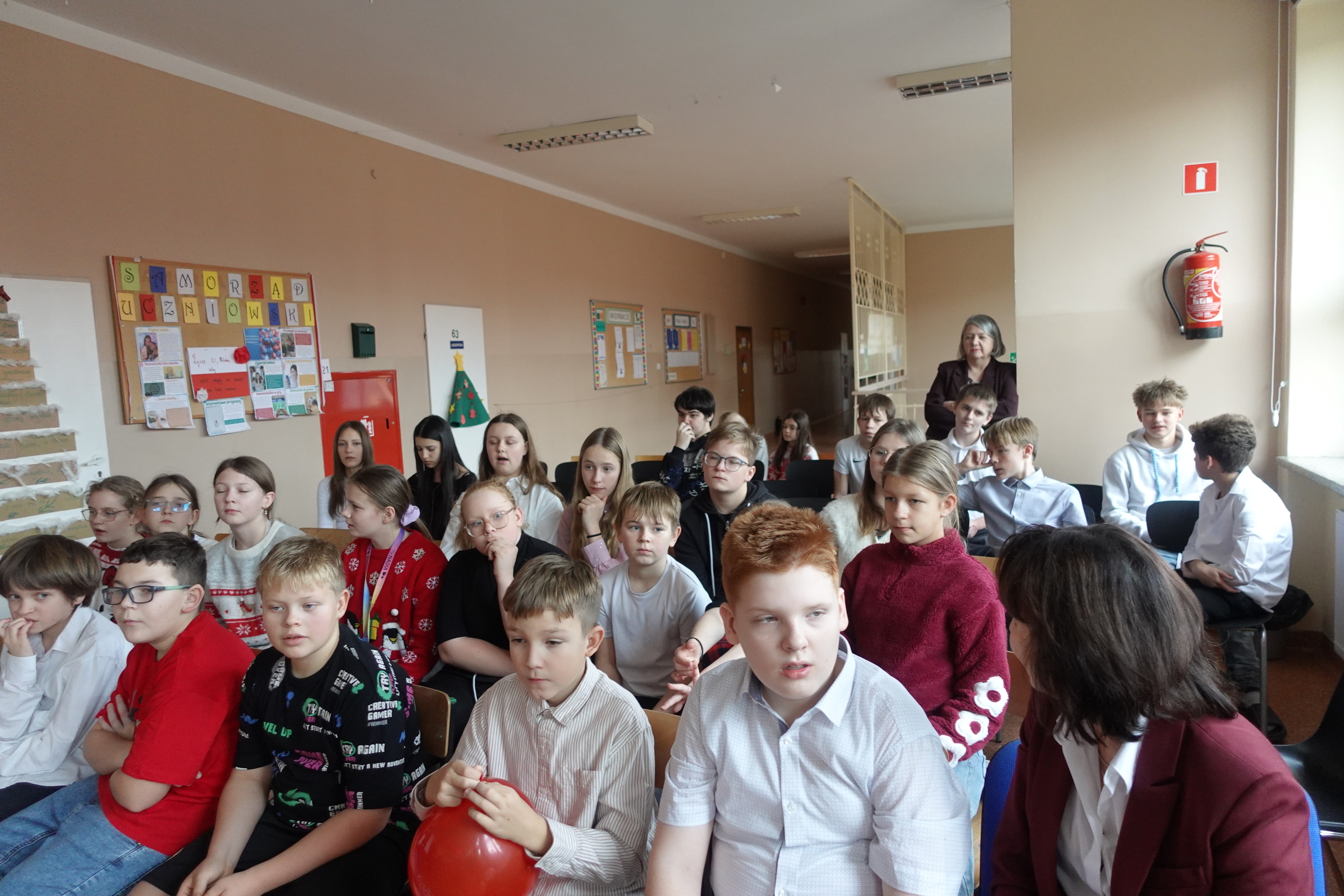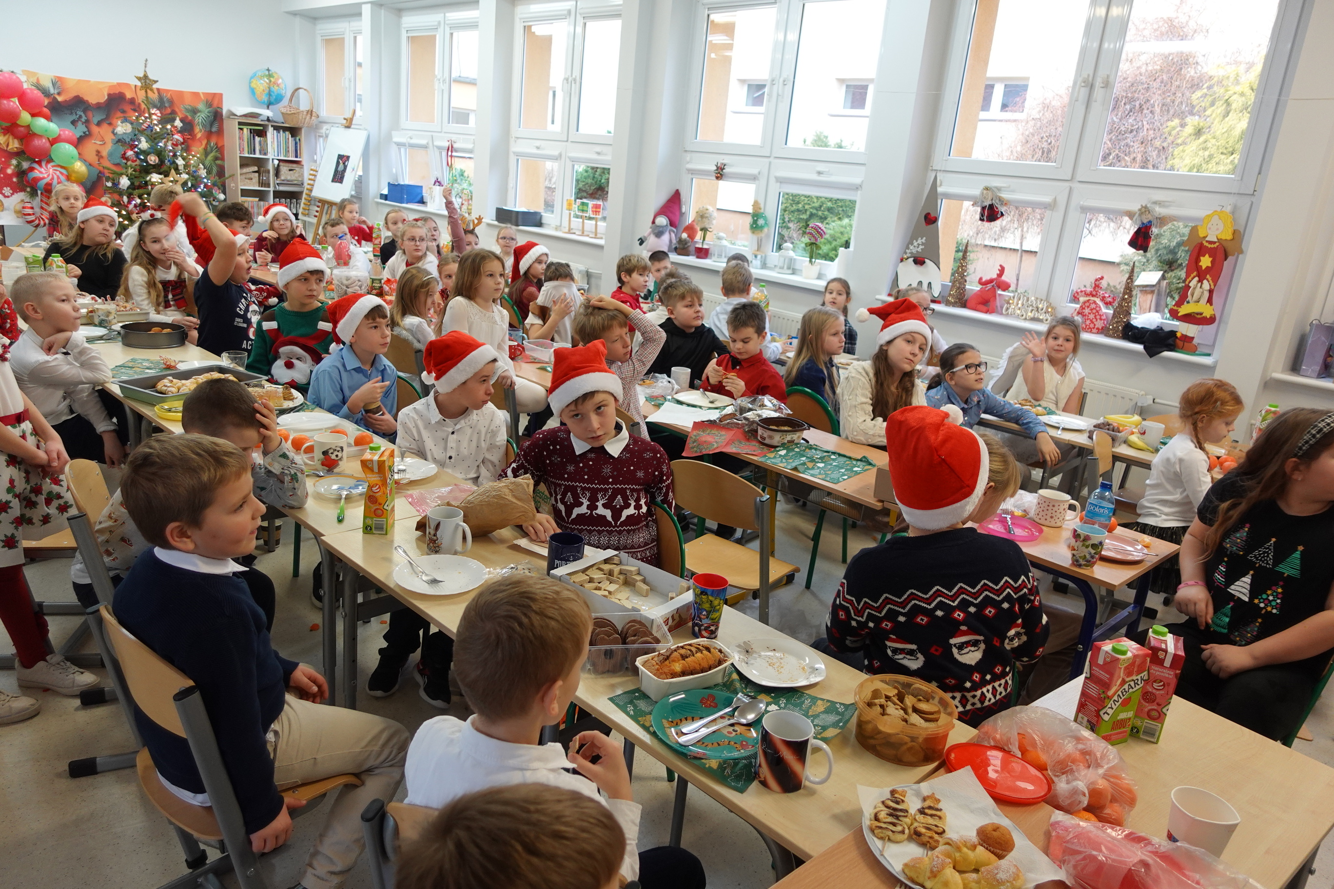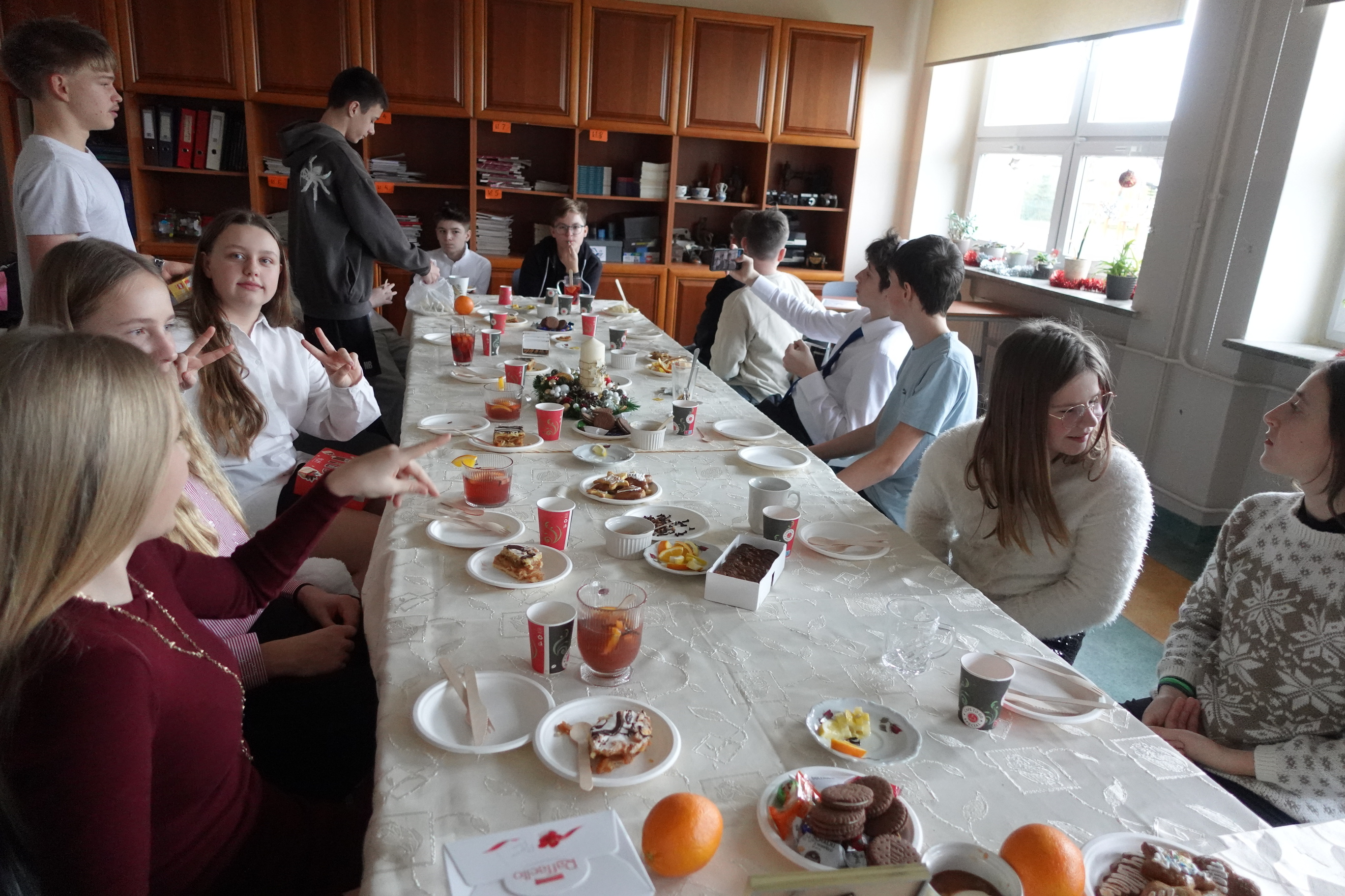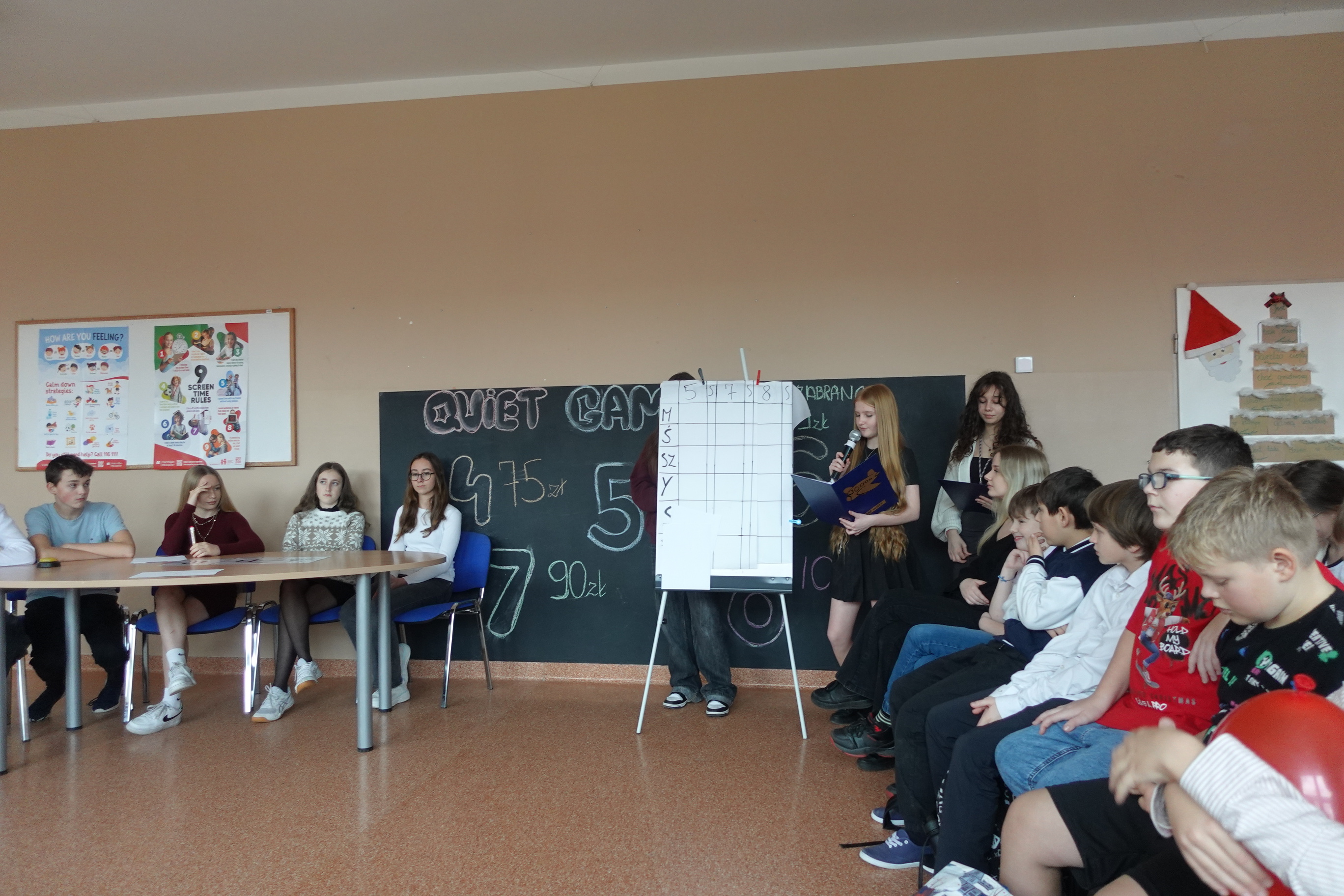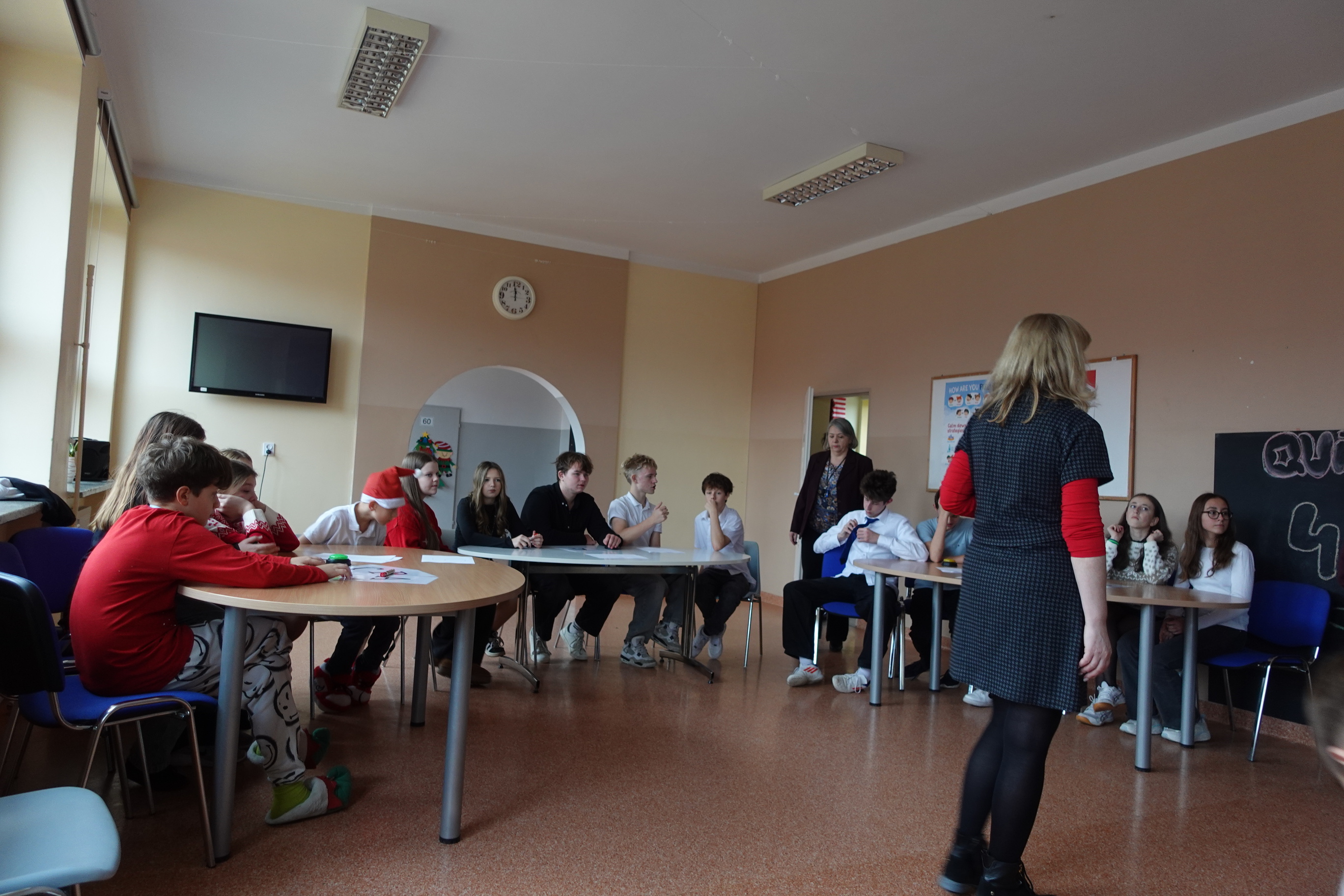 Na pierwszej lekcji uczniowie klas 4-8 zaśpiewali nam kilka „choinkowych” piosenek, a dziewczyny z klasy 7 zaprezentowały swój układ taneczny, wprowadzając nas w świąteczny nastrój. Po wspólnym kolędowaniu, chłopcy z drużyn piłkarskich pokazali nam swoje talenty w turnieju piłki nożnej. Po tych rozgrywkach uczniowie wraz z nauczycielami udali się do swoich klas, by wspólnie usiąść do stołu wigilijnego. Po uroczystym posiłku szkolna społeczność wzięła udział w świątecznym quzie z różnych dziedzin. Po udanej rywalizacji klasy 5, 7 oraz 8 udały się na świetlicę obejrzeć wspólnie „Baranka Shauna”. Był to ostatni dzień w szkole, widzimy się dopiero za rok.