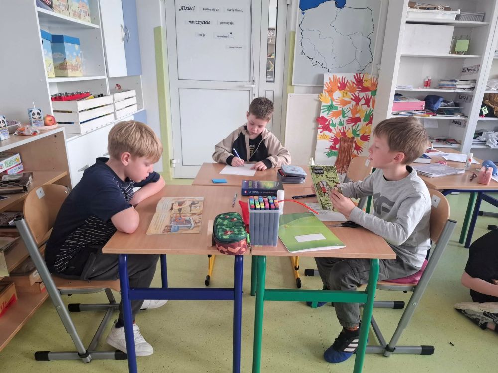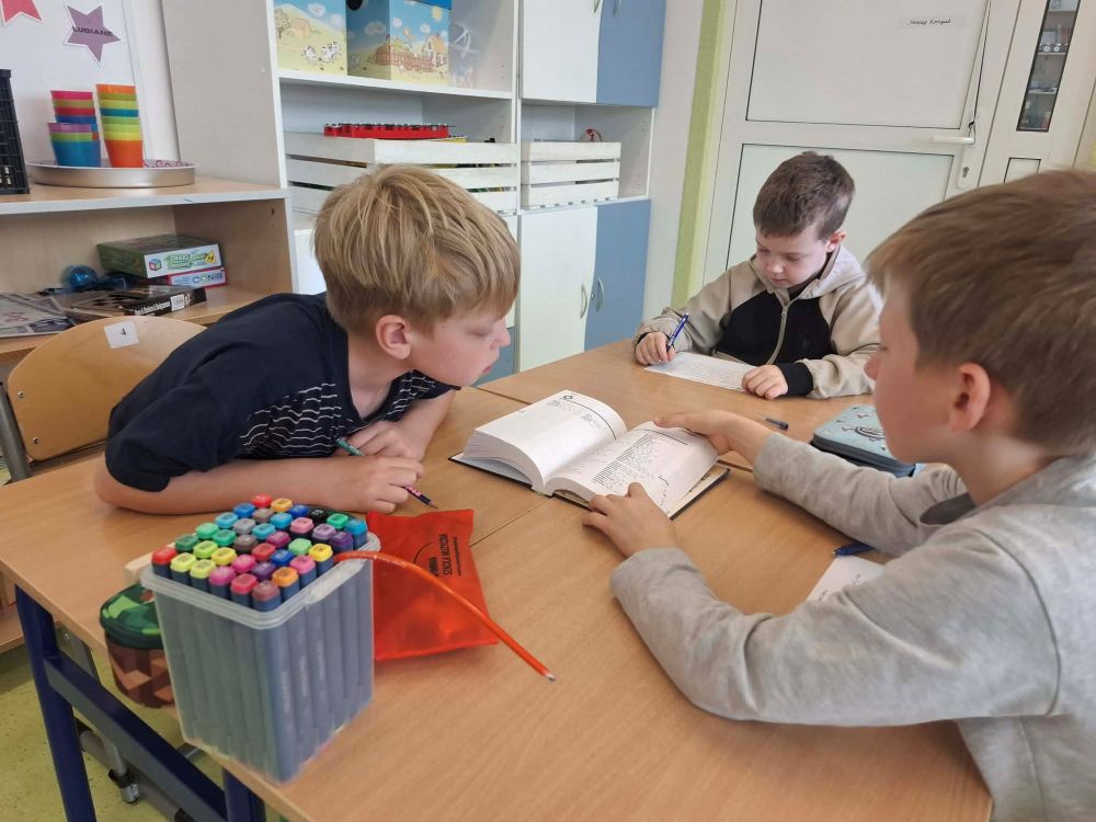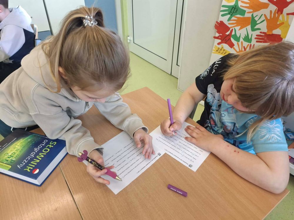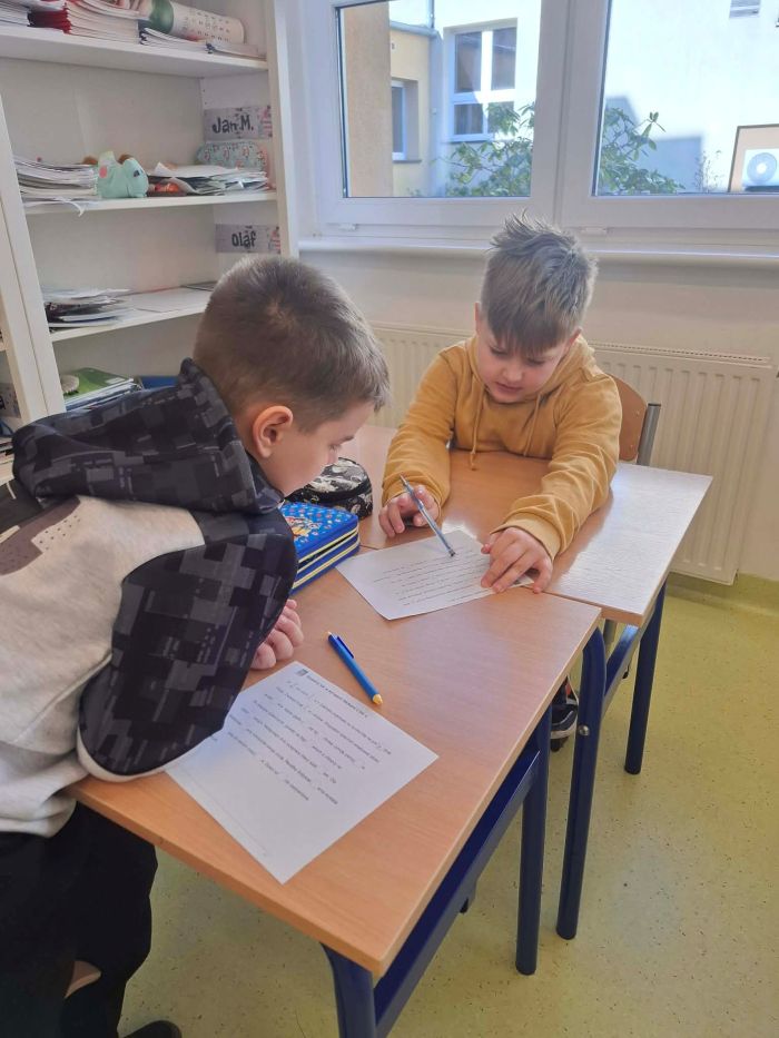 Od początku swojej szkolnej przygody drugoklasiści pracują zgodnie z zasadami Oceniania Kształtującego. Podczas ostatnich zajęć z edukacji wczesnoszkolnej uczniowie, współpracując ze sobą, realizowali zadania zawarte w celu lekcji oraz kryterium sukcesu. Najpierw rozwijali swoje umiejętności czytelnicze pracując z wybraną przez siebie książką. Dzieci czytały fragmenty tekstów, a następnie dzieliły się spostrzeżeniami na jej temat. Następnie uczniowie, pracując w parach, utrwalali zasady ortograficzne - poprzez pracę ze słownikiem ortograficznym uczyli się wyszukiwać potrzebne wyrazy. Ostatnim elementem było tworzenie urodzinowej kartki z życzeniami. Wszyscy przypomnieli sobie zasady pisowni i formułowania życzeń zwracając szczególną uwagę na poprawność językową i ortograficzną.