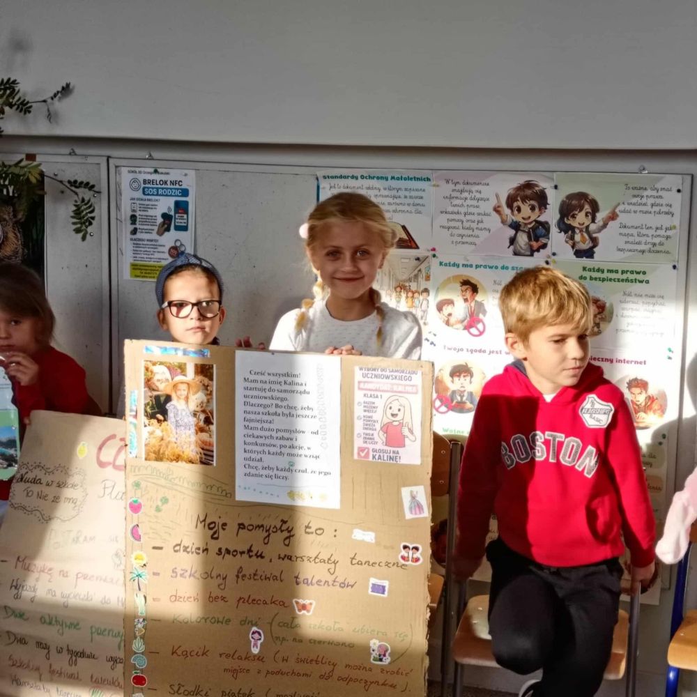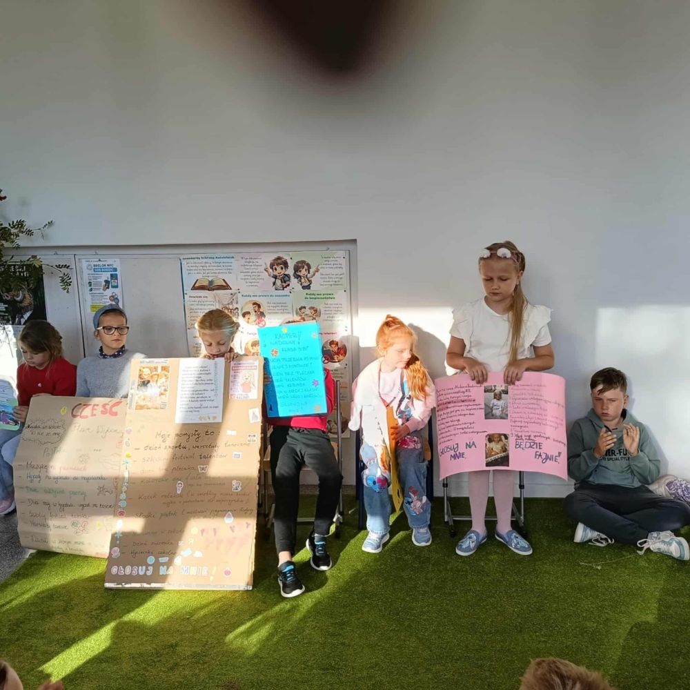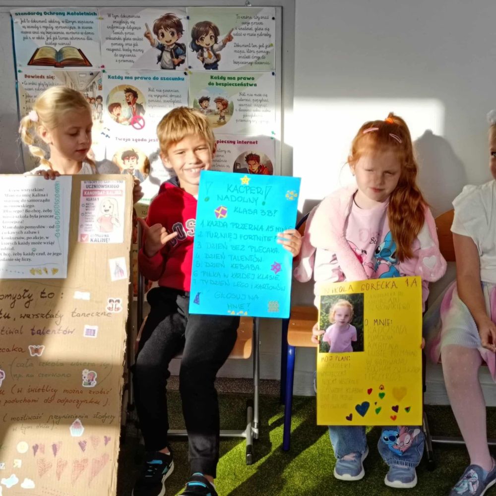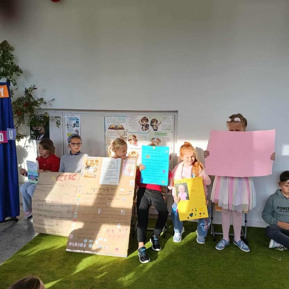 Jak co roku w edukacji wczesnoszkolnej odbyły się wybory. Startowało sześciu kandydatów, każdy przygotował plakat i swoją strategię wyborczą. Niektóre pomysły zmian były naprawdę zaskakujące. W drodze tajnego głosowania nową przewodniczącą została Milenka Babiuch, a zastępcą Kacper Nadolny. Pozostałe osoby, które weszły w skład Samorządu to: Ania Arciuch, Marysia Zacharska, Nikola Górecka i Kalinka Kubiak. Gratulacje !